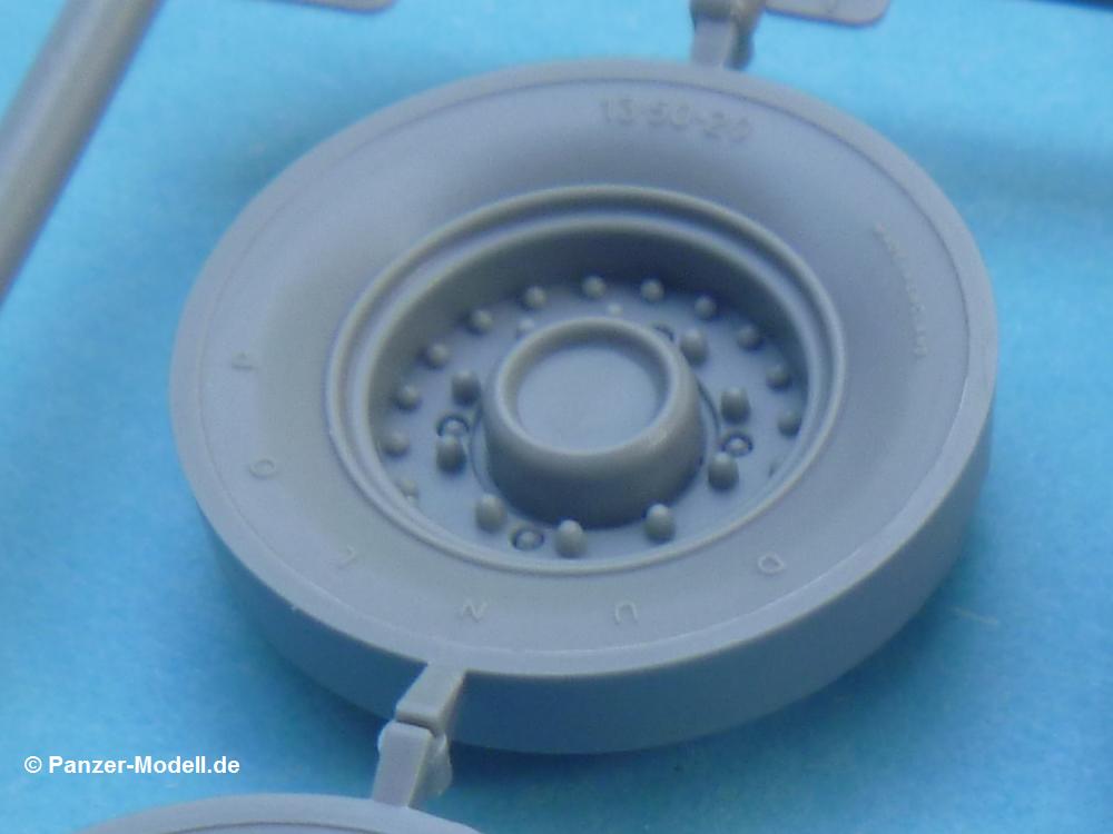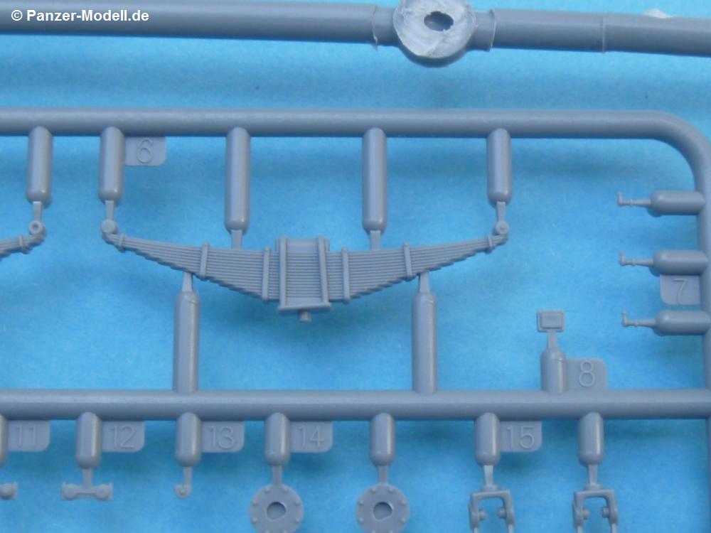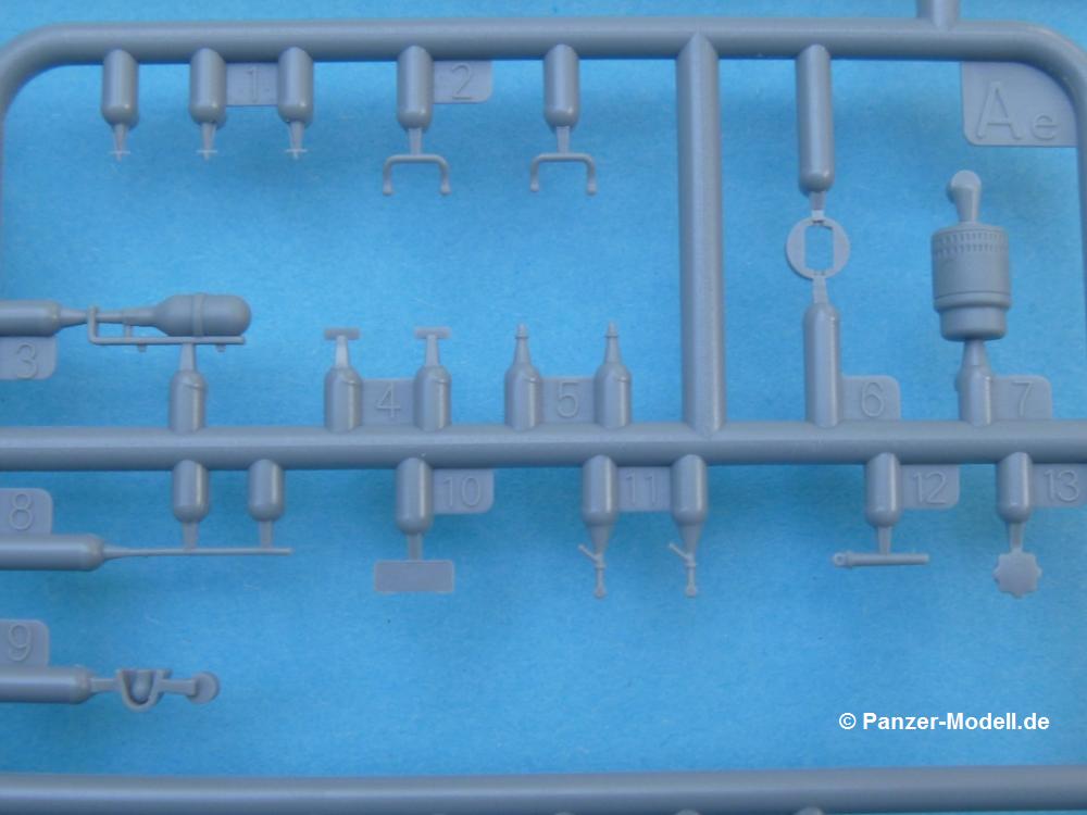 AEC (Associated Equipment Company) stellte 1941 das auf dem Fahrgestell des AEC Matador entwickelten AEC Armoured Car bei einer Parade in London vor. Das Mk.I hatte 3 Mann Besatzung und war mit einem 105 PS (78 kW) starken Diesel Motor ausgestattet, mit dem es ca. 58 km/h erreichen konnte. Die Bewaffnung bestand aus einem Valentine II Turm mit einer QF 2 Pounder (PaK Kaliber 40 mm); zusätzlich ein koaxiales MG. Vom Mk.I wurde 129 Stück hergestellt. Er wurde ab den letzten Monaten des Jahres 1942 hauptsächlich in Nordafrika eingesetzt. Seine Nachfolger Mk.II und Mk.III waren stärker bewaffnet und mit einem 158 PS (118 kW) Dieselmotor ausgestattet. Eine weitere Variante war mit einem Crusader AA Turm zur Flugabwehr ausgerüstet. Als erstes angekündigt, als zweites auf den Markt gekommen. MiniArt bringt uns hier das erste AEC Armoured Car, das Mk.I. Die Unterschiede zum Mk.II sind bereits durch den Valentine Turm mit der QF 2 Pounder PaK und der anderen Fahrzeugfront zu erkennen. Die hellgrauen Spritzlinge füllen den Karton gut aus. Insgesamt sind es 12 hellgraue, 1 klarer und 4 hellgraue Radreifen. Dazu kommt eine Ätzteilplatine, ein sparsamer Abziehbilderbogen (Decals) und eine 16-seitige Bauanleitung im A4 Format. Die Spritzlinge sind wie folgt aufgeteilt: - A (2x): Sandbleche, Kraftstoff- u. Munitionsbehälter, Munition - Ac (1x): Teile für Fahrersitz, Schwenkgetriebe für Turm - Ad (2x): Radfelgen, Blattfedern u. Aufhängungen, Kardangelenke, Flansche - Af (1x): Turmsitz, Halterungen an Motortrennwand - Ae (2x): Munitionsbehälter, Griffe, Feuerlöscher, Seilkauschen, Kleinstteile - B (1x): Kühler, Achsen, Tank, Getriebe - Ba (1x): Motor, Auspuff, Kupplung, Einspritzpumpe, Lenkrad, Bremstrommeln, Achsenden - C (1x): Turmboden, Munitionshalterungen, Außenstaukästen, Kotflügel, Kardanwellen, Motoraufnahme und -schutzrahmen - D (1x): Turm, Kanone, Blende. Funkgerät - Gd (1x): Winkelspiegel, Fahrerschutzscheibe - H (4x): Reifen - PE (1x): Schutzbügel f. Funkgerät, div. Halterungen Der 345x240x80 mm große Karton überrascht mit einer Fülle an Spritzlingen und Teilen, die man vom Anblick des Deckelbildes nicht erwartet. Ein kurzer Blick in die Bauanleitung verrät, dass das meiste im Inneren des Fahrzeugs seinen Platz finden wird. Die Teile aus grauem Plastik sind sauber gespritzt, ohne Verzug und Versatz, kein Grat, keine Fischhäute oder Sinkstellen. Einige wenige Auswerferspuren auf Innenseiten von Teilen, so dass die Spuren beim Zusammenbau verschwinden, ohn das man sie wegschleifen und verspachteln müsste. Aber gehen wir mal die Spritzlinge einzeln durch und schauen genauer hin. Spritzling A (2x): Die Sandbleche mit den Querrippen haben eine für Plastik annehmbare Stärke und kommen der Wirklichkeit recht nahe. Die Kästen für das Turmheck bestehen jeweils aus dem 5-seitigen Kastenkörper und dem passenden Deckel dazu. Gleiches gilt für die typisch britischen Kraftstoffbehälter, nur das hier am Deckel der Ausgußverschluß mit angegossen ist. Griffe sind nicht dran. Diese kommen erst beim Bau von der Ätzteilplatine. Die etwas über 1 mm durchmessende 2-Pfünder Munition ist am Ende mit einem sternförmigen Clip versehen. (Viel Spaß beim Bemalen, wenn man alle 44 Kartuschen verwenden will.) Die Munition ist ohne Kopf, aber dieser wäre nach Einstecken in die Halterungen im Turm sowieso nicht mehr zu sehen. Spritzling Ac (1x): Der Spritzling besteht hauptsächlich aus den 9, teilweise filigranen, Teilen des Fahrersitzes. Das Sitzpolster ist leicht gewellt, um die Kissenstruktur darzustellen. Weiterhin finden wir die 4 komplexen Teile des Turmschwenkgetriebes hier. Mit den Ecken, Winkeln und Nieten haben die Spritzformbauer einen fantastischen Job hingelegt. Die Millimeter großen Scharniere und Beschläge der Fahrerluke, bzw. der kleinen Schutzscheibe werden beim Abtrennen vom Spritzling die volle Aufmerksamkeit brauchen, sonst verschwinden sie mit dem ersten Atemzug im Nirwana. Das Armaturenbrett(chen) hat mal 2 Anzeigen, für die es keine Abziehbilder gibt. Selbst anmalen ist hier die Devise. Spritzling Ad (2x): Ins Auge stechen die Blattfedernpakete. Jede Blattfeder ist sauber zu erkennen. Schön auch die Räder mit ihren unzähligen Radmuttern und den Herstelleraufdrucken und Radgrößen auf den Seiten - DUNLOP - 13-15-20 - Made in England. Dazu kommen Kardangelenke und Deckel, bei denen man scheinbar keine einzige Schraube vergessen hat. Spritzling Ae (2x): Die größten Teile sind die Munitionskästen und die aus einem Stück bestehenden Luftfilter. Der Feuerlöscher mit angegossener Halterung lässt kein Detail vermissen. Achtung: Auch hier Kleinteilalarm! Motorraumklappenverschlüsse kleiner als 1 mm, Außenspiegelhaltestange mit ca. 0,4 mm Durchmesser sind nur einige. Der Tankdeckel mit seinem gewellten Rand ist da schon wieder ein großes Teil. Die Abschleppschäkel sind durchbohrt, damit man später den passenden Bolzen, an dem das Auge für das Sicherungskettchen erkennbar ist, durchstecken kann. Die Seilkauschen haben eine schöne Struktur, nur habe ich in der Bauanleitung keine Verwendung dieser Teile gefunden. Ein Abschleppseil übrigens auch nicht. Spritzling Af (1x): Einer der beiden kleinsten Spritzlinge. Hier finden wir Halterungen für die Motortrennwand, eine Stabilisierungsstange für das Fahrgestell und den Turmsitz. Spritzling B (1x): Der 2-teilige Kühler hat es einem gleich angetan. Beidseitig sind die Kühlrippen dargestellt. Die Achsen bestehen aus einem Teil, auf das nur der Kardandeckel aufgesetzt wird. Also, keine Angst vor Trennnähten, denn es gibt keine. Weitere Teile sind Schaltgestänge, Aufnahmen für die Federpakete, Querlenker und das Allradgetriebe. Spritzling Ba (1x): Die Hauptteile des Motors bestehen aus einem 3-teiligen Motorblock, Ölwanne, Zylinderkopfdeckeln, Einspritzpumpe, Auspuffkrümmer und Anbauteilen. Diesel-, Ölfilter und Kompressor sind weitere Details. Der Hammer - die 6 Einspritzdüsen müssen separat verkle