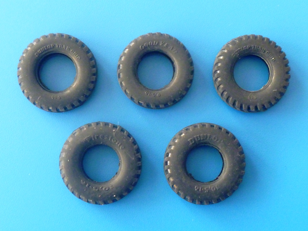Das Original: Ich habe mir vorgenommen, zu jedem meiner AUSGEPACKT ein wenig zum Original zu sagen. Aber was sagt man über Original Reifen, die im 2. Weltkrieg Verwendung auf alliierten Fahrzeugen fanden? "Hallo?" Scherz beiseite. Gesucht, gesucht, aber richtig fündig geworden bin ich nicht, außer dass sich die Angaben auf den Reifen auf die Breite und der Felgendurchmesser jeweils in Zoll beziehen. 9 x 16 bedeutet also 9 Zoll breit, Felgendurchmesser 16 Zoll. Ich hoffe, man kann mir in diesem Fall den Mangel an Hintergrundinformationen verzeihen. Der (Bau)satz: Nanu, was bringt uns Mirror Models denn hier? Bekannt für seine kombinierten Plastik, Resin und Ätzteilbausätze kommt die Firma mit einem Satz Gummireifen um die Ecke. Gummi hat ja in Modellbauerkreisen nicht mehr unbedingt einen guten Ruf, da durch Verflüchtigung der Lösungsmittel die Gummiteile dazu neigen, hart zu werden, zu schrumpfen und zu reißen. Vielleicht hat sich ja in den Jahren an der Zusammensetzung etwas geändert, dass so etwas nicht mehr passiert. Die Zeit wird es zeigen.In einem wieder verschließbaren Plastiktütchen finden sich 5 Reifen, die Verwendung auf CMP (Canadian Military Pattern) und anderen alliierten Fahrzeugen Verwendung fanden. Wer von den Älteren unter Euch noch die erste Serie "Mit Schirm, Charme und Melone" kennt, erinnert sich vielleicht an den Teil, in dem ein britischer Alvis Saracen Radpanzer geschrumpft wurde. Und die Mirror Models Räder sehen aus, riechen und fühlen sich an wie geschrumpfte Originale! Zudem sind sie innen hohl, als warteten sie nur drauf, auf Felgen aufgezogen zu werden.In meiner Tüte befinden sich folgende Reifen:· Dunlop Track Grip 9 x 16 (2x) (S-förmiges Profil quer zur Laufrichtung liegend) *1