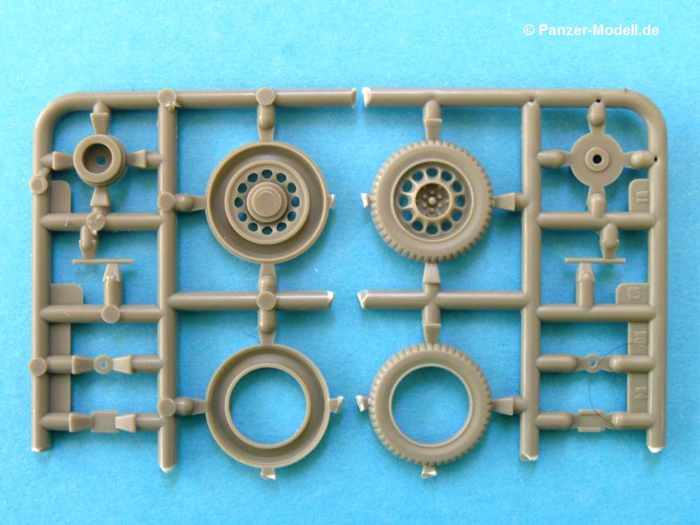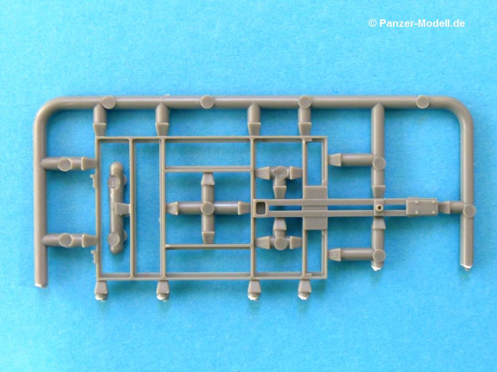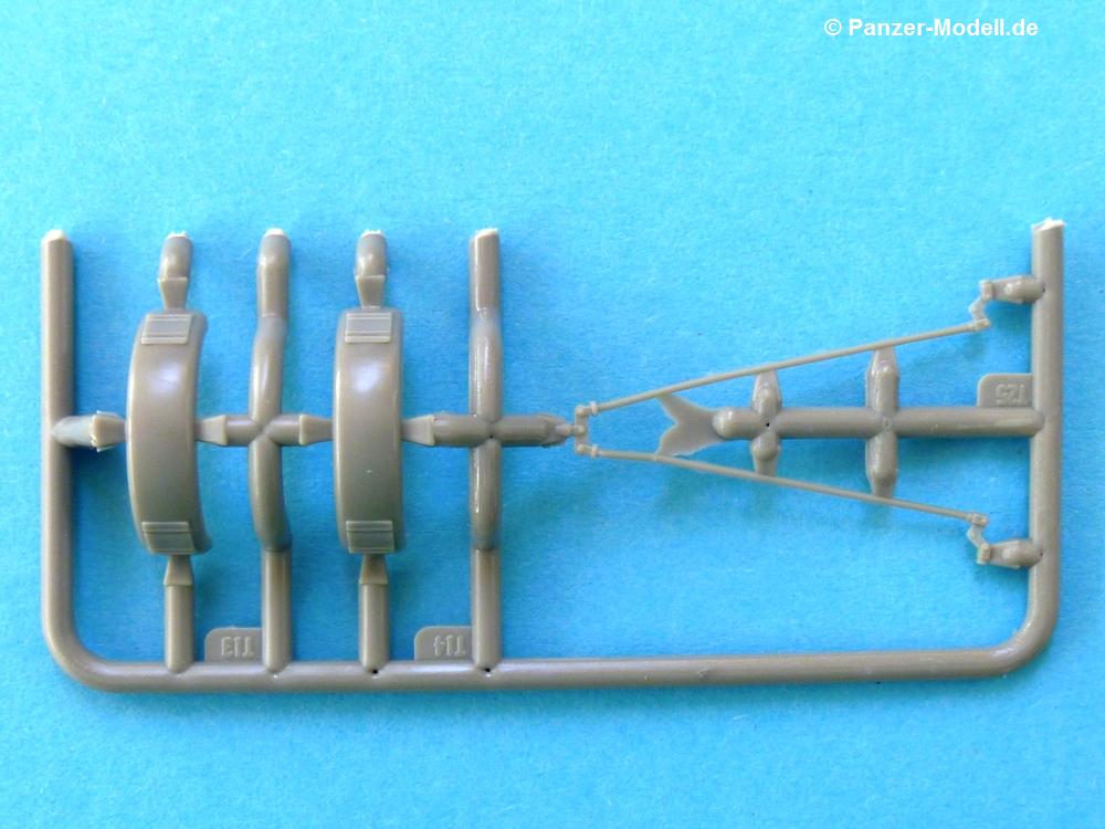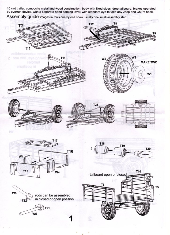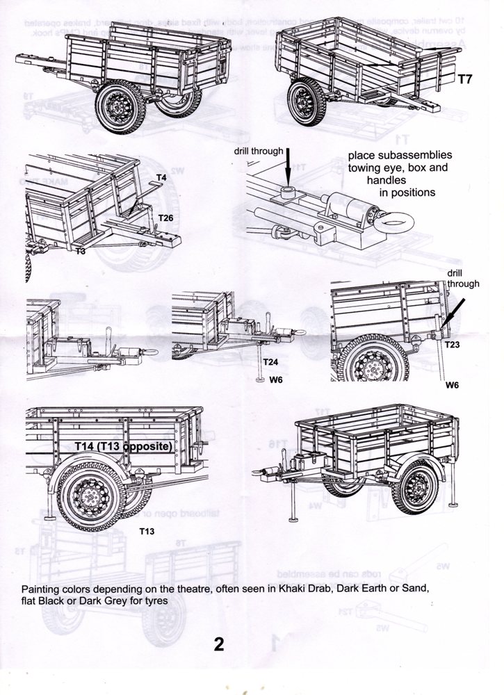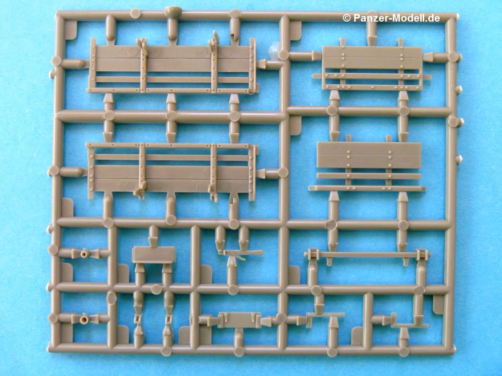 Der von den Kanadiern produzierte 10 CWT Trailer GS war ein einachsiger Anhänger zum Einsatz hinter Jeeps und leichten Lkws (15 CWT) gedacht. Im 2. Weltkrieg wurden die Gewichte mit Zentnern (CWT) angegeben. 10 CWT entsprachen also einer 1/2 Tonne. Es gab verschiedene Versionen. In unserem Fall besteht der Anhänger (Trailer) aus Metallrahmen/-profilen mit Holzbeplankung. Die Rück- und Seitenwände waren feststehend, nur die Heckklappe ließ sich (wie der Name vermuten lässt) herunterklappen. Mit Plane durfte der Anhänger bis zu ca. 15 cm über Oberkante beladen werden, Gewicht der Ladung max. 500 kg. Gebremst wurde er über eine Auflaufbremse. Noch nicht so lange am Markt überrascht uns die irische Firma Mirror Models diesmal mit dem Bausatz eines, bzw. zweier 0,5 to. Anhänger. In der 16 x 11,5 x 3 cm kleinen Verpackung befinden sich pro Anhänger 6 Plastikspritzlinge. 6 deswegen, weil die 2 Originalspritzlinge ganz offensichtlich auseinander geschnitten wurden, damit die Teile in den kleinen Karton passen. Daher gibt es auch nur Nummernbezeichnungen mit T oder W beginnend. Mirror Models kommt diesmal ganz ohne Resin- und Ätzteile aus. Die Spritzlinge sind wie folgt aufgeteilt: - 2x Unterrahmen - 2x Boden, Blattfedern, Zugöse, Stützstangen - 4x innere und äußere Radhälfte, Bremstrommel, Kleinteile - 2x Bordwände, Heckklappe, Hebel und Ösen - 2x Kotflügel, Bremsgestänge Die Teile sind sauber gespritzt und ohne Versatz. Nur hier und da ist etwas Grat zu erkennen. Das Plastik erscheint recht hart und spröde (Bruchgefahr beim Lösen vom Spritzling). Leider gibt es bei den seitlichen Bordwänden auf den Innenseiten kleine Sinkstellen (bei Beladung nicht mehr sichtbar, falls man sie nicht wegspachteln möchte) und auf den Außenseiten recht flache Auswerferspuren, die sich aber leicht beseitigen lassen sollten. Bei manchen Teilen machen mir die etwas stärkeren Angüsse Sorgen, besonders bei dem filigranen Bremsgestänge. Bei den Holzteilen ist keine Maserung in dem Sinne erkennbar, welches maßstäblich richtig ist. Auch bei lackierten Originalen ist nichts mehr zu erkennen. Jeder Anhänger besteht aus 41 Teilen und bietet trotz der Einfachheit verschiedene Variationsmöglichkeiten. Man kann die Heckklappe geöffnet oder geschlossen darstellen, im angehängten Zustand mit hochgefahrenen Stützen und eingeklappten Handgriffen, im abgehängten Zustand mit heruntergelassenen Stützen und ausgeklappten Handgriffen zur Bewegung des Anhängers von Hand. Der Werkzeugkasten auf der Deichsel kann ebenfalls offen oder geschlossen gebaut werden. Der Handbremshebel an der Deichsel kann scheinbar aber nur in einer Stellung (Bremse gelöst) gebaut werden. Die 2-seitige A4 große Bauanleitung in schwarz-weiß Druck zeigt in 20 Skizzen und mit englischer Beschriftung, wie der Anhänger entsteht, ist aber etwas gewöhnungsbedürftig und sollte trotz der wenigen Teile aufmerksam studiert werden. Mal weisen Pfeile darauf hin, wo welches Teil hingehört, mal hat man eine Gesamtansicht und muss schauen, wo welche Teile gelandet sind. Ich habe die Bauanleitung mehrfach gewendet um herauszufinden, wohin die Handgriffe W5, die mit der Halterung T21, bzw. T22 auf Seite 1 verbunden werden, gehören. Verwirrend fand ich auch, dass die 4 langen, dreieckigen Angüsse an jeder Seitenbordwand am Anfang der Bauanleitung nicht dargestellt sind, so dass ich sie erst für Angüsse hielt, die man abschneiden muss, aber am Ende der Anleitung sieht man, dass dies die Halterungen für die Kotflügel sind. Farbangaben sind vage gehalten - Khakifarben, dunkelerdbraun oder sandfarben, je nach Einsatzort, mattschwarz oder dunkelgrau für die Räder. Es gibt keine Herstellerempfehlungen für die Farben. Ein Bausatz mit Licht und Schatten. Kommt man mit der Bauanleitung erst einmal klar, hat man die Hürden der Angüsse überwunden, werden aus den Teilen sicherlich 2 wunderbare Anhänger entstehen, die einen Jeep oder 15 CWT Chevrolet aufpeppen. Auch in einem Diorama sind sie sicherlich gut einsetzbar. Mit ca. 18,00 EUR für 2 Anhänger halb so teuer wie die Resinausführung eines anderen Herstellers ist der Bausatz im deutschen Modellbauhandel erhältlich. .