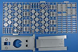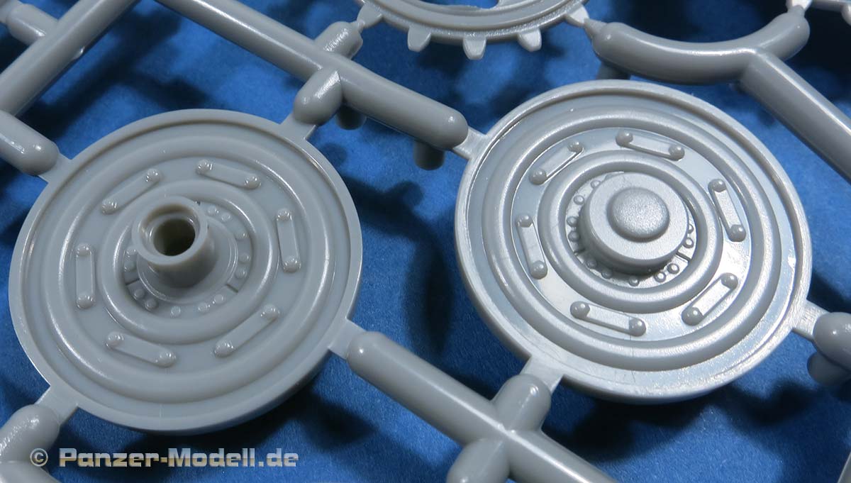 Die Unterwanne ist einteilig, was den Bau extrem vereinfacht. An der Wanne selber befindne sich nahezu keine Details - an den Seiten die Nippel und Vertiefungen zum Anbringen der Fahrwerksteile - das war es aber auch schon. Diese Fahrwerksteile sind die typischen horizontalen Doppelfederlementen, wie sie bei den E-50 und E-75 angedacht waren, an denen jeweils zwei Radstationen angeordnet waren. Dazu Das Vorgelege und die Treibräder sowie an hinteren Ende der Kurbelarm mit Treibrad. Die Räder allesamt sehen ganz gut aus - sauber gespritzte Stahllaufrollen mit feinen Radbolzen, am Treibrad auch feine Radmuttern, wobei sich hier auch ein wenig Fischhaut an den Zähnen des Zahnkranzes findet.