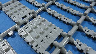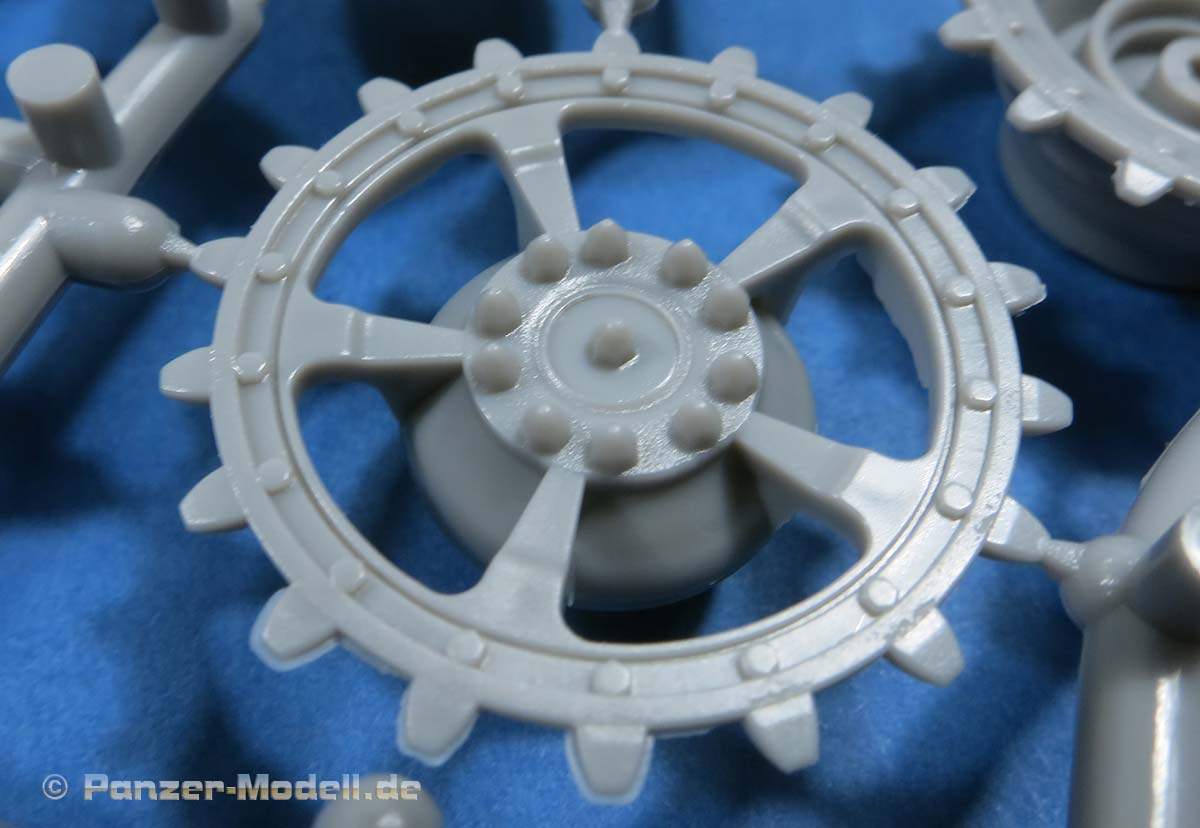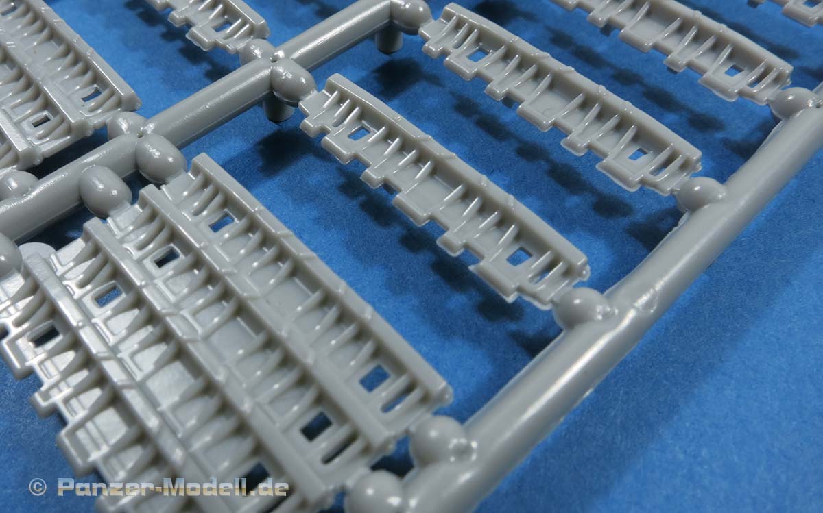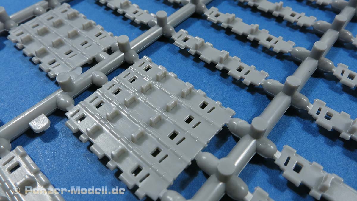 Ja, die Kette ist eine Segmentkette mit längeren und kürzeren Kettenstücken und Einzelgliedern für die Radumläufe. Hier zeigt sich vor allem die etwas softe Detaillierung - der die Rippung im Aussenbereich könnte deutlich schöner und "knackiger" sein. Auch die Teilung der Einzelglieder im Segmentstrang ist etwas schwammig und "flach".