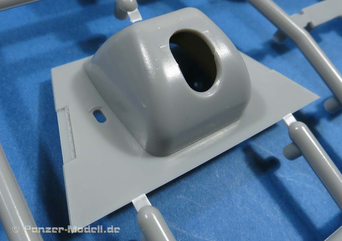 Die Kommandantenkuppel ist bereits mit eingegossen. Der Klappdeckel liegt einzeln bei und kann offen oder geschlossen gebaut werden. Was aber so gar nicht geht ist, dass die Aussparungen in der Kuppel für die Winkelspiegel leer bleiben. Man kann also in den leeren Turm hineinsehen.