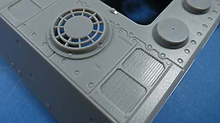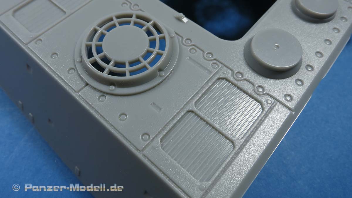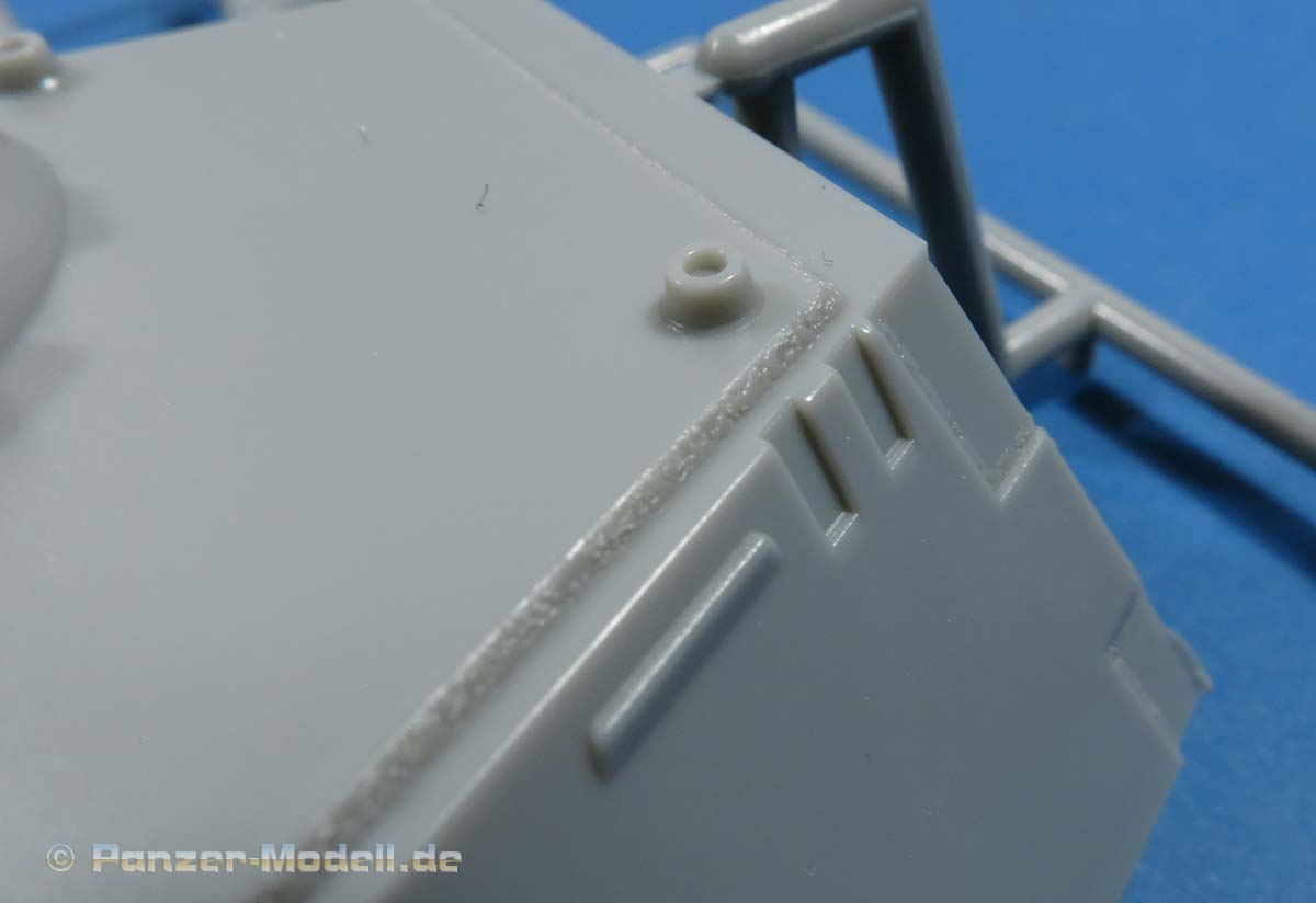 Die Oberwanne ist ebenfalls einteilig - hier zeigen sich schon deutlich mehr Details, die aber auch ein wenig ausgeprägter und schärfer sein könnten. So ist die Verzahnung der Panzerplatten zwar dargestellt, aber die Stuktur der Brennkante fehlt hier völlig. Dafür meint man in den Kanten eine kleine strukturierte Schweißnaht zu erkennen.