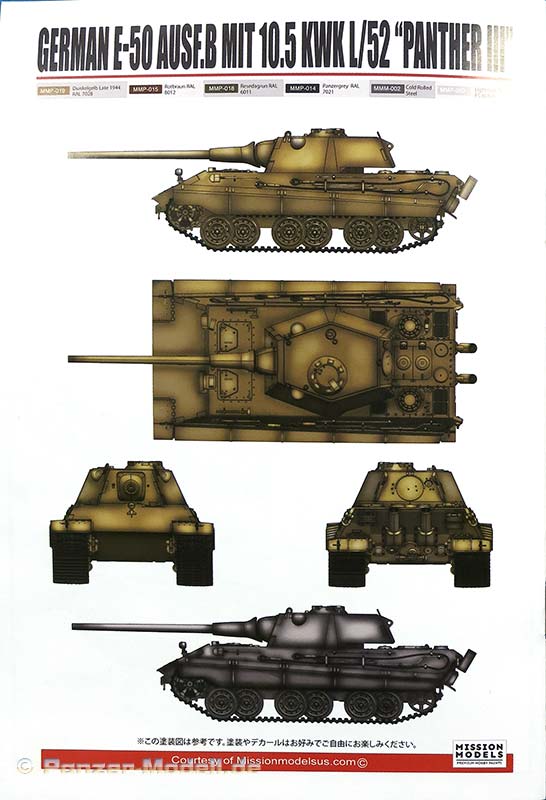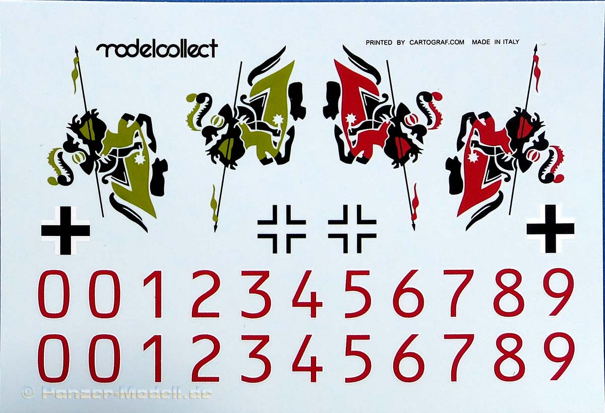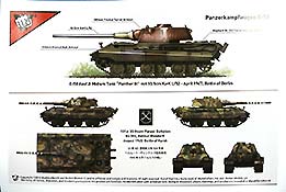 - dunkelgelb mit grünen Flecken, 101.SS.PzBtl., August 1945, Schlacht bei Kursk (die erforderlichen Markierungen liegen dem Decalbogen allerdings nicht bei)