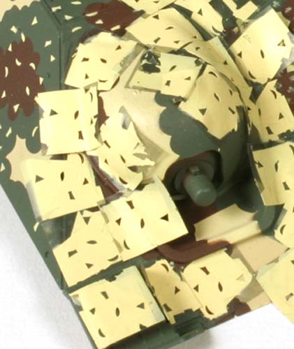 Zusätzlich befinden sich auf den Folien Maskierungspunkte und vor allem kleine Quadrate mit den kleinen Ausschnitten für die unregelmäßigen kleinen Flecken des BMM Hinterhalttarnmusters. Diese müssen dann frei nach Gusto des Modellbauers auf dem Modell verteilt und mit gelb nochmal übergebrusht werden.