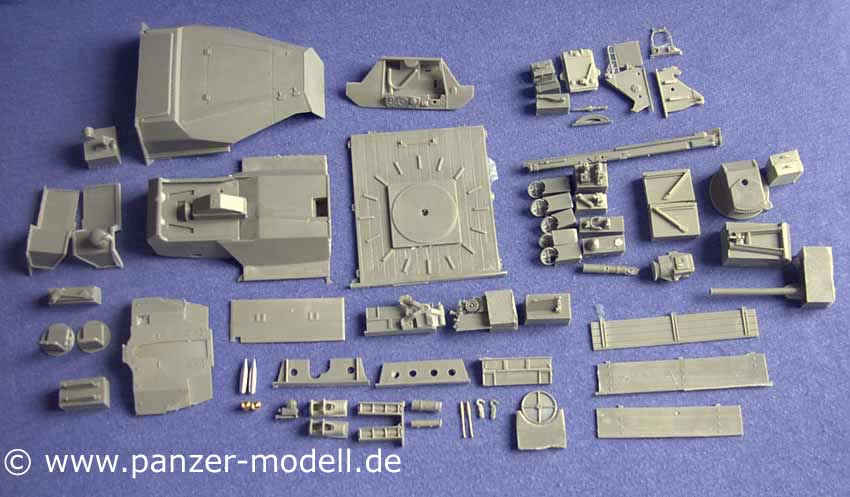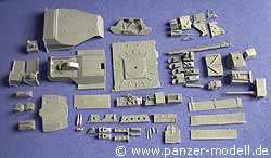 Frisch aus den Resinschmieden von New Connection kommt im August 2002 der Umbausatz 35230 "10,5cm lFH auf Sd.Kfz.251 (Sf)" auf den Markt. Dieser Umbausatz benötigt das Sd.Kfz.11 von AFV-Club als Basisbausatz. Im Umbausatz finden wir etwa 70 Resinteile, die allesamt sehr sauber gegossen sind ... Verzug und Luftblasen sind hier ein Fremdwort! Lediglich bei den Handrädern finden sich ein paar produktionsbedingte Fischhäute. Die Teile sind teilweise sehr filigran und gut detailliert gestaltet. Neben dem komplett