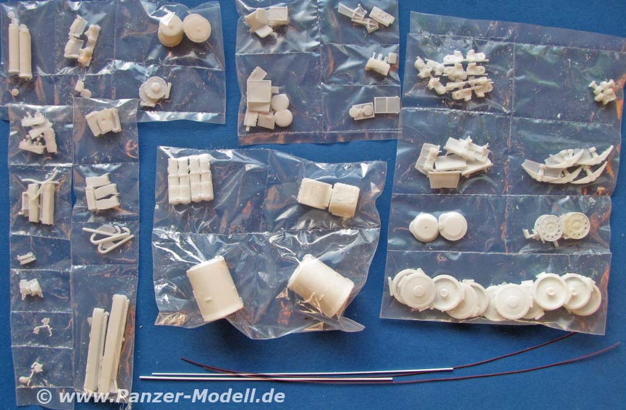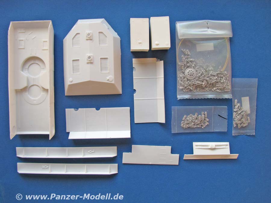 Der Bausatz ist ein Komplettbausatz, d.h. es wird kein Basisbausatz benötigt. Im Bausatz enthalten sind unter 100 Resinteile, Plastikrundmaterial und ein erweiterter Satz Friulmodel Ketten.