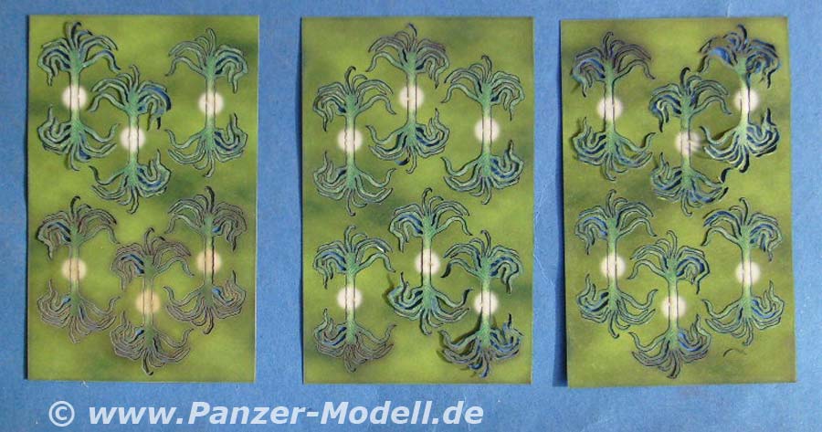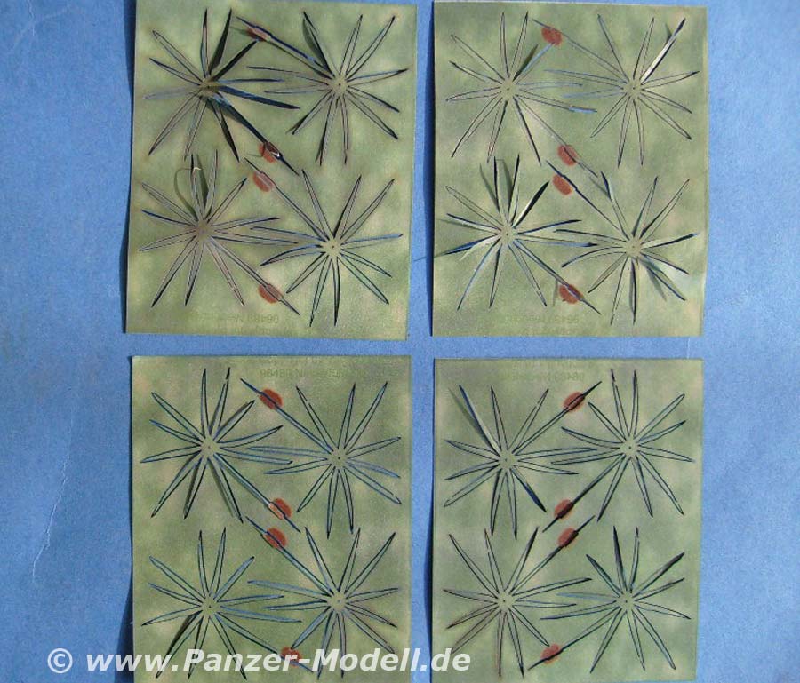Heute stellen wir euch etwas aus dem Eisenbahnbereich vor. Dabei handelt es sich um "Blühendes Gemüse vom Friedhof" und allerlei anderes Grünzeug. Von Schilf und wildem Wein, über Erdbeern und Rhababer bis zu Pestwurz ist alles dabei, was sich im Garten so finden läßt. Die einzelnen Pflanzen sind aus dickem, weichem Papier gelasert und dann lackiert. Durch den sauberen Schnitt und die mehrfarbige Bedruckung entsteht ein sehr natürliches Abbild der jeweiligen Pflanze. Allerdings sind dieser Technik Grenzen gesetzt. Es ist das selbe Problem wie bei Ätzteilen. Alles ist flach. Bei Blättern keine große Sache. Aber genau betrachtet sind die Erdbeeren etwas kantig. Eine wirkliche Alternative gibt es aber nicht. Der Gesamteindruck überzeugt, gerade wenn die einzelnen Pflanzen auf einem Diorama ein die übrige Vegetation eingearbeitet sind. Jede Packung zeigt anhand von drei etwas kleinen Farbfotos wie die Pflanzen verarbeitet werden. Dabei ist aber gerade das zurechtbiegen der Blätter und Stängel sicher reine Übungssache. Am besten die Natur als Vorbild nehmen. Fazit: Super! Gerade für Sommerdioramen! Normandy z.B.. Oder Omas Garten in Schlesien... Oder... In diesem Sinne...
