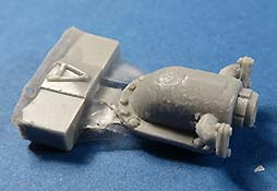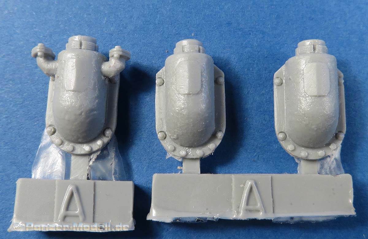 Die drei Stücke stellen die gegossenen Schutzblöcke an der Basis der beiden Auspufftöpfe dar, die bei Panther A zum Einsatz kamen und die Plastikteile in vorhandenen Bausätzen ersetzt. Dabei hat man für die linke Seite die Wahl zwischen dem normalen Auspuff oder der späteren dreiteiligen Ausführung.