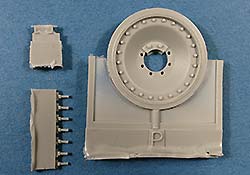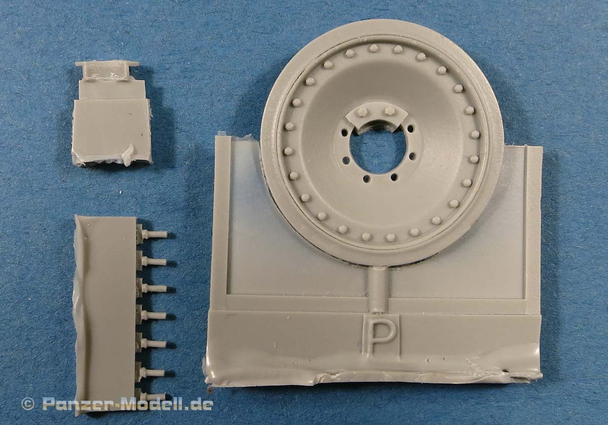 In der Blisterverpackung finden wir 9 Resinteile, die fein und sauber gegossen sind ohne Gießfehler sind und dazu sehr filigran mit der Darstellung der sehr kleinen und feinen Bolzen. Die Angüsse dieser Resinteile ist an der Basis und damit seh klein. Das Ersatzrad des Panthers ist zur Hälfte an der Lauffläche mit Anguss versehen, d.h. es ist etwas mehr Versäuberung vonnöten.