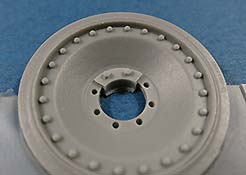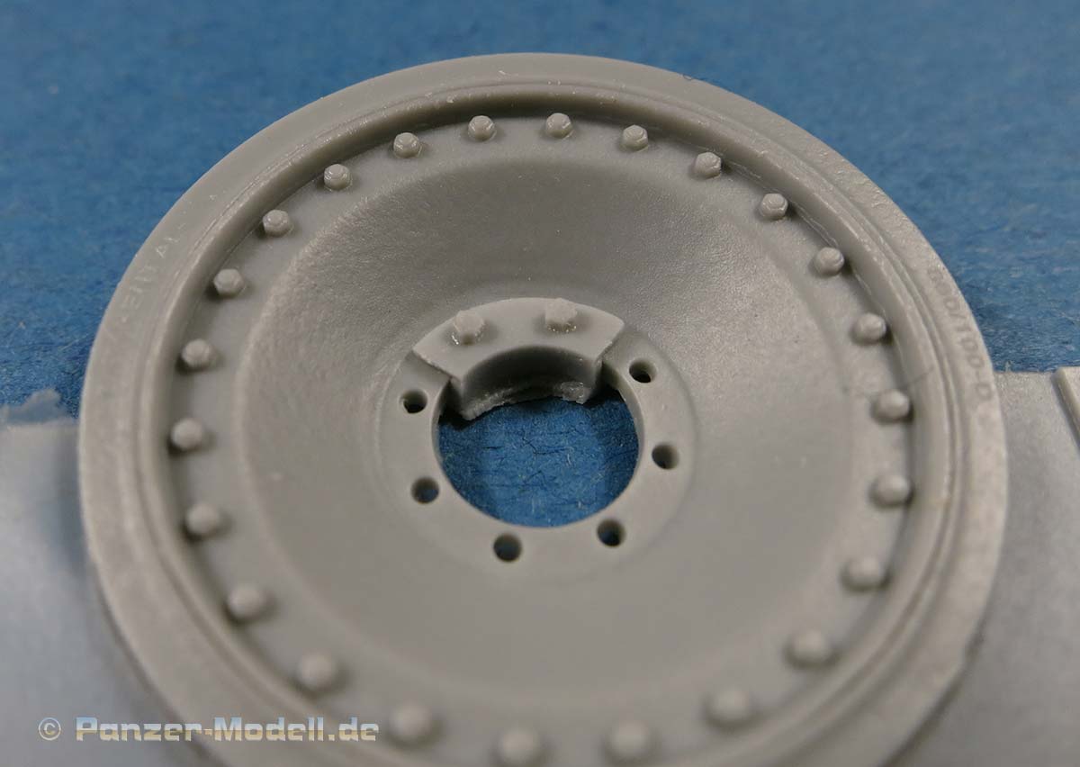 Die Laufrolle ist vom Typ mit 24 Bolzen, die alle sauber und sehr fein detailliert dargestellt sind. Zudem wurde auf der Gummierung die feinen Buchstaben der Herstelleraufdrucke aufgebracht - sehr fein und realistisch gemacht!