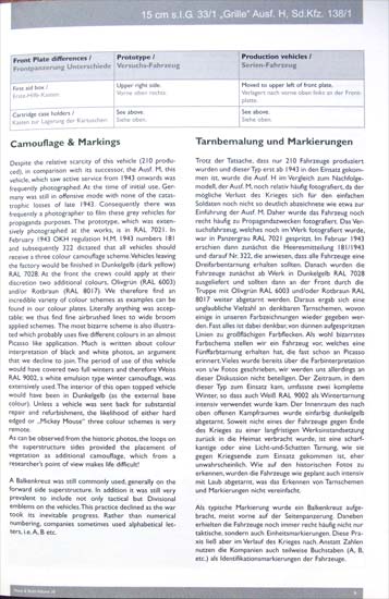 Das Heft beginnt mit 12 Seiten zu Entstehungsgeschichte und Produktion, Unterschieden der Prototypen zum Serienmodell (sehr vorbildlich in Tabellenform), Tarnbemalung und Markierungen, Technische Daten, Gliederungen, usw.
