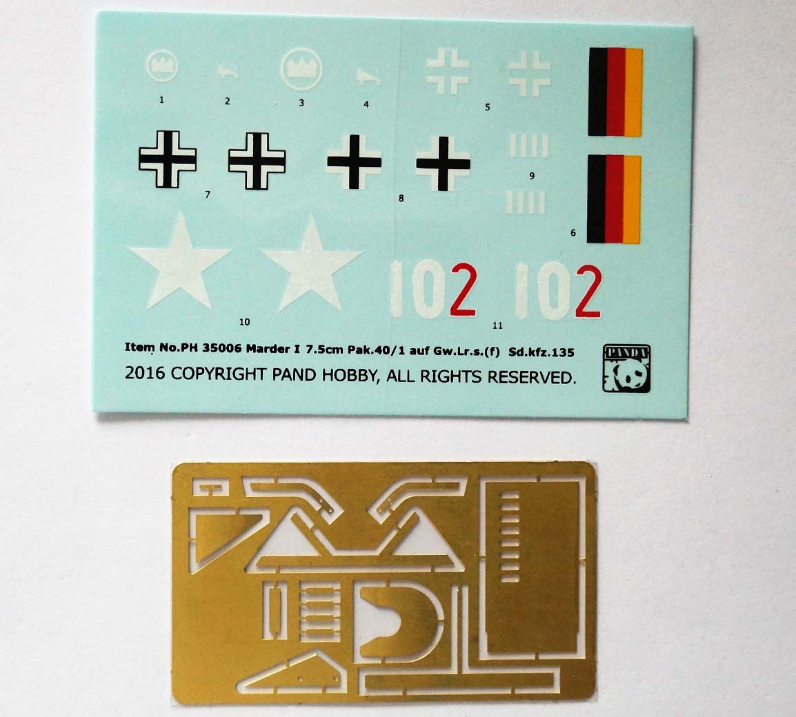Marder I 7,5cm Pak 40/1 auf Geschützwagen Lorraine Schlepper (f) Sd.Kfz. 135 Panda Hobby hat sich hier eines Fahrzeugs angenommen das mir bisher nur als mehr oder weniger gute Resinbausätze bekannt ist. Nach Öffnen der geräumigen Schachtel, die von einem ansprechenden Bild des Fahrzeugs verziert ist, fällt unser Blick auf erstaunlicherweise nur fünf Spritzlinge die den Marder I in Summe ergeben sollen. Eine kleine Ätzteilplatine und ein Abziehbilderbogen vervollständigen den Inhalt der Box. Alle Bauteile, resp. Rahmen sind durch Plastikbeutel geschützt. Auf den ersten Blick fallen keine großartigen Auswerfermarken und Fahnen auf. Nichts was man schnell beheben kann. Augenscheinlich alles im nicht sichtbaren Bereich. Zwei der Rahmen, in einem etwas dunkleren Braun gespritzt, entfallen auf die Ketten. Die einzelnen Glieder, vollständig frei von Auswerferstellen und Flash machen einen sehr guten Eindruck, dürften jedoch manch einen bei der Montage auf eine Nervenprobe stellen. Für den realistischen Durchhang ist eine Lehre beigefügt. Interessant ist die ungewöhnliche Aufteilung der Fahrwerke, bei dem eine ganze Reihe von Komponenten in einem Stück gespritzt sind. Keine schlechte Vorgehensweise da das Fahrwerk sonst in zu viele einzelne Bauteile aufgebrochen werden müsste. Insgesamt machen die Bauteile einen durchaus filigranen Eindruck. Auch die restliche Teile des Fahrwerks erscheinen in einem guten Licht. Den einzigen eventuellen Nachteil sehe ich in der Tatsache, dass das Laufwerk nicht beweglich gemacht werden kann. Ebenfalls einen guten Eindruck hinterlassen die Komponenten, die für den Bau des Fahrzeugs selbst sind. Angenehm dünn und verzugsfrei kommen sie daher. Für das Innenleben des Kampfraums ist alles Notwendige vorhanden, incl. eines Funkgeräts. Das Kanonenrohr ist in einem Stück gespritzt und sollte sich gleichfalls ohne Probleme verbauen lassen. Auch die Teile der Pak hinterlassen einen guten Gesamteindruck. Die Aufbauten des Kampfraums scheinen ebenfalls eine maßstäbliche Dicke zu besitzen. Lediglich die beiliegenden Granaten erscheinen mir zu kurz. Das konnte ich aktuell aber nicht verifizieren. Die Ätzteile sind ausreichend und für die Auspuffabdeckung liegt ebenfalls eine Lehre bei. Markierunge sind für fünf Fahrzeuge angegeben; wieder mal die Unsitte ohne Hinweis auf Einheiten etc.. Abhilfe schafft hier ein Blick in das Internet. Die Bauanleitung bringt in nicht überladenen 12 Schritten den Modellbauer zum Ergebnis. Der Kit verspricht viel Bastelspaß in einem vertretbaren Rahmen. Geeignet sicher schon für den fortgeschrittenen Einsteiger. Für rund EUR 40 kann man diesen Bausatz in seinen Stash einverleiben.