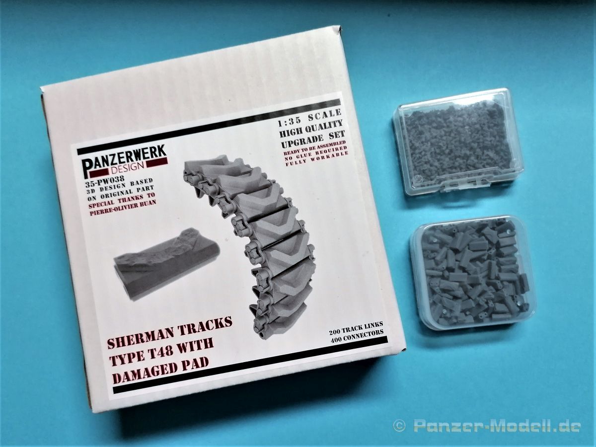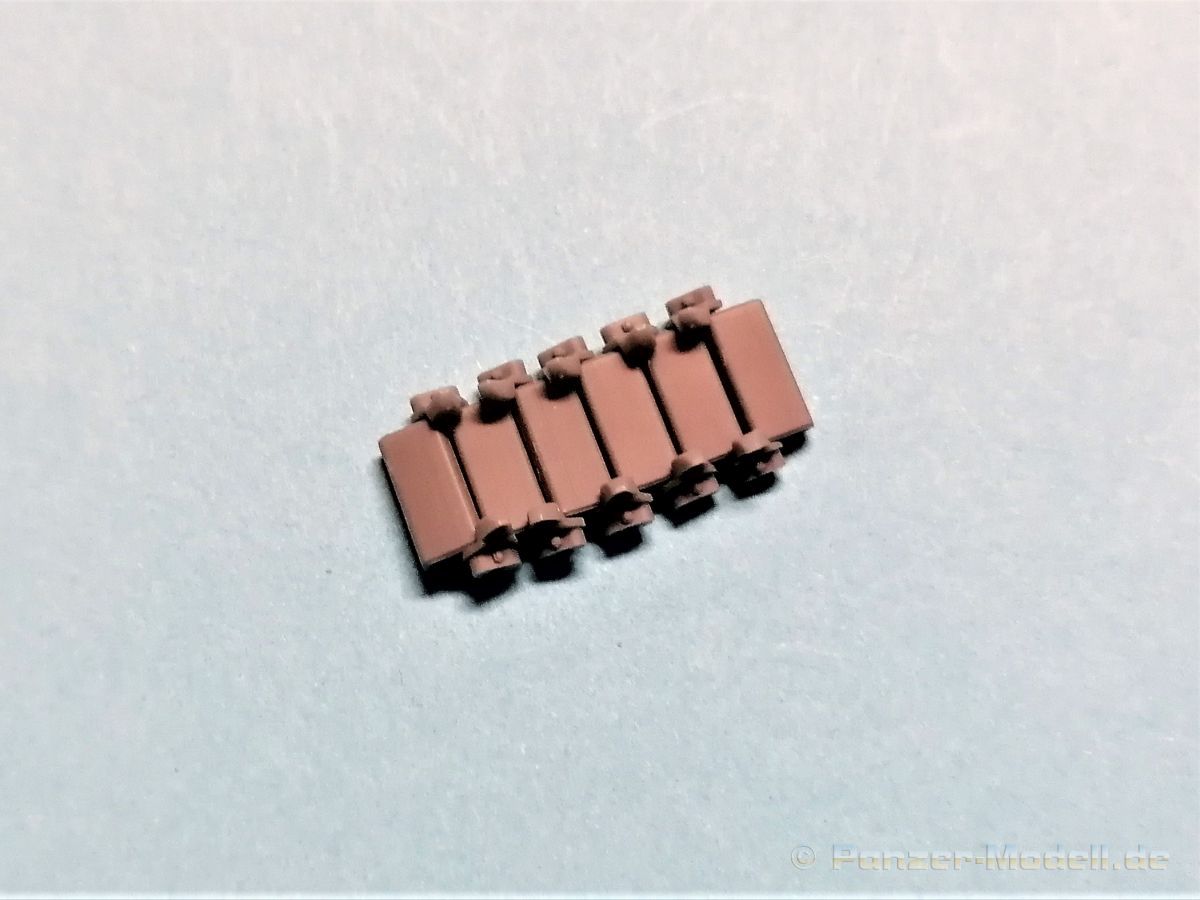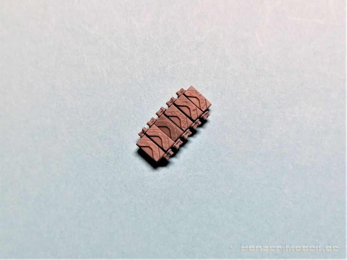Type T48 ist die Bezeichnung des Kettensatzes (für Sherman) der uns heute auf dem Basteltisch liegt.. Einen Vergleich, das auch hier schon vorweg, mit den Originalteilen brauchen die gedruckten Teile nicht zu scheuen. In der ca 14x4x15 cm Kartonage befinden sich zwei Plastikkistchen die die Kettenglieder und Verbinder absolut sicher schützen. Damit haben wir eine 3D-gedruckte, vollbewegliche Einzelgliederkette, für deren Montage erneut keinerlei Versäuberungsarbeiten durchgeführt werden müssen. Der Druck ist ausgezeichnet sauber, detailreich und fehlerfrei. Mit bloßem Auge sind keine Fehler, auch Druckfehler auszumachen. Alles wirkt wie aus einem Guß. Ungemein realistisch wirken die abgenutzten Gummiauflagen. Toll umgesetzt. Jeweils zwei Kettenglieder werden mit zwei recht filigranen Verbindern zusammengeführt. Diese lassen sich erstaunlich leicht und einwandfrei in die jeweiligen Bohrungen einführen. Eine spitze Pinzette erleichtert die Prozedur ungemein. Aber bitte alles mit Gefühl und nicht mit Gewalt. Für die Montage ist als Hilfe noch ein kleines Merkblatt beigefügt. Top! Bei der gelieferten Menge an Kettengliedern dürften noch einige als Reserve überbleiben. Ein Verkleben ist laut Packungsaufdruck nicht nötig. Obwohl die meisten Verbinder recht gut halten ist es meiner Meinung nach ratsam die Bolzenköpfe doch zu sichern. Sekundenkleber, Mattlack oder auch normaler Kleber. Aber sehr sparsam. Das Set überzeugt auf ganzer Linie.