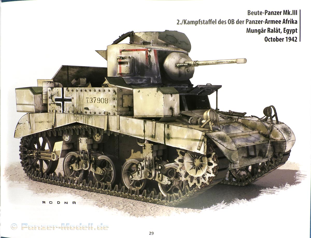Die Autoren von Panzerwrecks haben es nun wieder mal geschafft die 96 Seiten dieses DIN A4 Bandes im Querformat mit 156 tollen und spannenden Fotos zu füllen. Wie bereits gewohnt, sind diese Fotos wieder in einer unglaublich hervorragenden Bildqualität, auch bei komplett seitenfüllender Darstellung. Zusätzlich zu den schönen Fotos gibt es sechs Farbillustrationen von einzelnen Aufnahmen von Felipe Rodna. Diese sind ganzseitig direkt gegenüber des Originalfotos abgedruckt und zeigen den Panzer in exakt der gleichen Position und gibt so eine tolle Illustration dessen, wie man das schwarzweiß Foto interpretieren kann. Auch in diesem Review sei es nochmal für alle, die die Serie noch nicht kennen, explizit gesagt: trotz des Titels sind die gezeigten Fahrzeuge nicht immer wirklich Wracks - viele weisen Beschädigungen auf, sind aber ansonsten noch relativ oder sogar komplett intakt. Andere sind tatsächlich Wracks, zeigen aber damit bemerkenswerte Details, die man sehen sollte. Auf jeden Fall hervorragendes Vorbildmaterial für Dioramen- und Modellbauer. Gerade was Ausrüstung und Tarnschemen an den Fahrzeugen angeht, sind diese Fotos Gold wert. Die Fotos sind jeweils mit ausführlichem, englischem Erklärungstext versehen, der auf Besonderheiten bzw. Ort und Zeit der Fahrzeuge auf den Fotos hinweist. Dieser 22.Band hat diesmal auch nur zwei größere Hauptthemengebiete - das eine "Allied Armor in DAK Service" umfasst 18 Seiten und zeigt einige seltene und hochinteressante Fahrzeuge der Alliierten wie Stuart I, Crusader oder auch Valentines, die im Dienste des DAK standen und für Modellbauer spannende Vorlagen gibt diese ins Modell umzusetzen. Bei dem anderen Thema geht es auf 16 Seiten um den Pz.Jgr.38 für 7,62cm Pak 36, auch als Marder III Sd.Kfz.139 bekannt. Hier werden tolle und bisher unveröffentlichte, großformatige Aufnahmen dieses Panzerjägers gezeigt - auch hier wieder sehr interessant für Modellbauer bezüglich Bemalung, Markierungen, Ausrüstungsgegenständen, usw. Den Rest des Heftes füllen dann Seiten voll mit Fotos der verschiedensten Panzerfahrzeuge vom Schauplatz des Wüstenkriegs in Afrika. Größtenteils gute und bisher nie gezeigte Aufnahmen und dazu ausführliche Bildunterschriften, die über das Fahrzeug, Einheiten, Ort und Zeit, sowie Besonderheiten des Fahrzeugs und den Beschädigungen Auskunft geben. Insbesondere die Reihe an Fotos der verschiedneen Panzer III timmt gut in das Thema ein und gibt gute aufschlussreiche Einblicke in diese Versionen der Panzer III, Deatils und Merkmale. Besonders interessant sind die Aufnahmen vom Panzer III, der mit Beton verkleidet wurde. Unter den gezeigten Fahrzeugen im Heft sind Panzer IV Ausf.F und G, Panzer III Ausf.H, J und M, gr.Pz.Bef.Wg. Ausf.H, Panzer II Ausf.F, 15cm sIG 33B Sfl, 4.7cm Pak(t) Sfl, Stuart I (Beute), Crusader II (Beute), Valentine (Beute), Pz.Jgr.38 für 7,62cm Pak 36, Lg.s.FH.13 (Sf), M13/40, M3 halftrack (Beute), Sd.Kfz.9, Sd.Kfz.251/10, Sd.Kfz.251/8, Sd.Kfz.251/6, Sd.Kfz.250/10, Sd.Kfz.250 w/2.5cm Hotchkiss PaK, Sd.Kfz.231, 232 und 233 (8-Rad), s.Pz.Fu.Wg. Sd.Kfz.263 (8-Rad), Kl.Pz.Fu.Wg. Sd.Kfz 261 und Sd.Anh.116 Wie die vorigen Bände, bietet dieser 22. Band der Panzerwrecks Reihe wieder hervorragendes und seltenes Fotomaterial - für Historiker und Modellbauer eine grandiose Fundgrube und mit den dazugehörigen Informationen zu den Fotos und Fahrzeugen einfach Gold wert. Die ergänzenden Zeichnungen sind eine schöne Zugabe und werten das Heft nochmal weiter auf. Sehr empfehlenswert! Panzerwrecks Vol.22