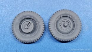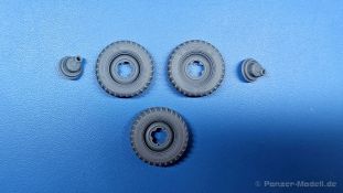 Der polnische Zubehörhersteller Pimp my miniatures ist zwar erst seit letztem Frühjahr aktiv, aber bereits sehr rege im Geschäft mit hochqualitativen Resin-Produkten. Heute hat uns ein Reifen-Set für einen Kübelwagen erreicht das einem Standard-Modell ein neues Aussehen verschafft. In einem stabilen Pappschachtel mit Klappdeckel, 100 x 60 x30 mm groß, befinden sich wiederverschließbare Klarsichttütchen mit 9 3D-gedruckten Resinteilen. Die Qualität ist sehr gut. Man erkennt viele, feine Details und keine Druckfehler. Die Teile kamen ohne Druckbasis und -strukturen. Ich konnte nicht mal etwas zum Versäubern erkennen. Insgesamt bekommt man 5 Räder und vier Radnaben. Wie der Titel bereits verrät, haben wir eine Mischbereifung vor uns. Für die Vorderräder sind die schmaleren Standardreifen vorhanden, für die Hinterräder (und das Ersatzrad) breitere Reifen mit grobstolligem Profil. Die Profile sind ansprechend wiedergegeben, die Reifenflanken tragen in erhabenen Buchstaben/Zahlen/Symbolen Herstellername, Felgengrößen, Bezeichnungen wie Gelände/Extra-Gelände und erkennbar das Continental-Logo mit dem aufsteigenden Pferd. Außer dem Ersatzrad sind alle Reifen belastet dargestellt, d.h. ein wenig abgeflacht und ausgewölbt an der Unterseite. Das Ersatzrad zeigt auf der Felge 3 Schraubenköpfe für die Befestigung auf der Ersatzradhalterung des Modells. Die Radnaben unterscheiden sich zwischen Vorder- und Hinterrädern. Gemäß der Auslegung sollten sie auf die meisten gängigen Kübelwagenmodelle passen. Das Set verleiht dem Kübel einen besonderen Look. Den Preis um die 11,50 Euro in Deutschland finde ich im Rahmen bei dem Gebotenen.