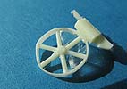 Recht interessant finde ich die Darstellung der Speichenräder - hier habe ich zunächst gedacht, dass durch die wahnsinnig dübber Umrandung der Guss das rad so unrund gemacht hat, aber bei genauerer betrachtung ist das gewollt, denn echte Räder dieser Bauart bekommen in der dünnen metallumrandung extrem schnell Macken und Dellen zwischen den Speichen. So geben diese Resinräder dem ganzen einen realistischen wenn auch eigenwilligen Touch. Die Räder werden übrigens nur zum Transport aufgesteckt und liegen in Feuerstellung neben dem Werfer.
