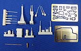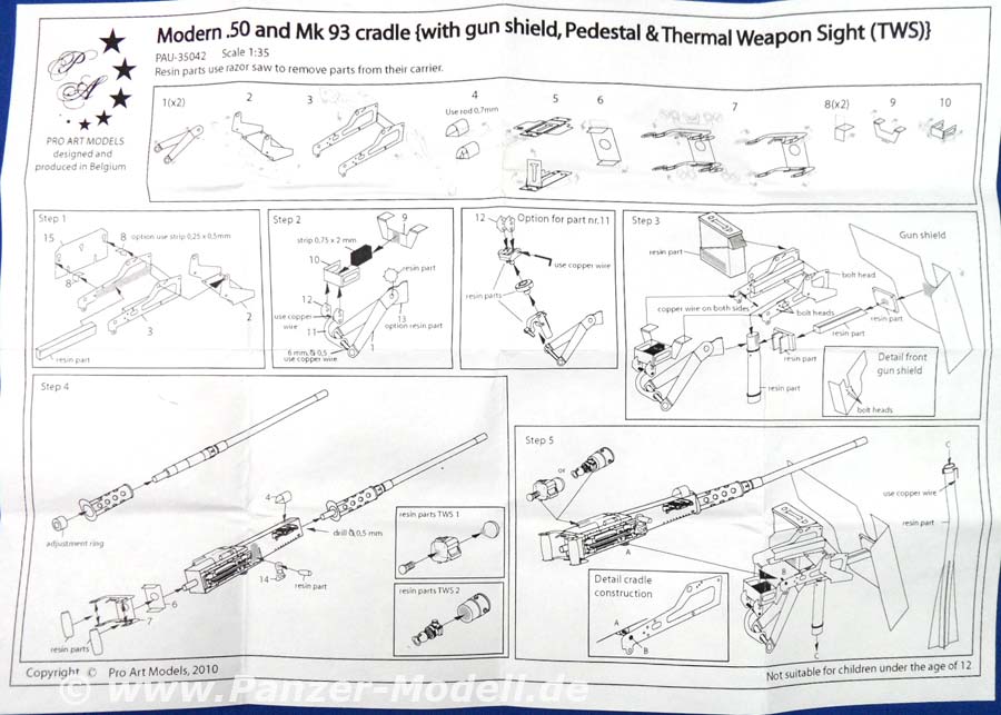Modern .50 and Mk93 cradle (with gun shield, pedestal & TWS) „Kleiner Karton, großer Name und exorbitanter Inhalt“ wäre wohl der passendste Untertitel zu diesem Set für den LMTV „Special Forces War Pig“. Sozusagen ein Zurüstsatz zum Umbausatz. Geliefert wird eine kleine, aber sehr feine, Anzahl heller Resinteile, eine Platine Ätzteile und ein aus Messing gedrehtes, dreiteiliges Rohr! Und das in erstklassiger Qualität. Bravo! Das Highlight ist sicherlich der Lauf des MGs, welcher aus drei Teilen besteht, wobei das kleinste als Abstandshalter zwischen Lauf und gelochtem Mantel dient. Die bisher beste Lösung um den Mantel auf Abstand zu halten, finde ich. Ein weiteres Highlight ist das TWS (Wärmebildzielgerät), welches gleich in zwei Ausführungen beiliegt. Der Rest des Satzes, wie etwa Munitionskiste, MG-Korpus, Schild und der Standfuss stehen dem in Nichts nach! Insgesamt herausragend, aber sicher ein ganz schönes Stück Arbeit, welche eher nur dem erfahrenen Modellbauer anzuraten ist. Fazit: Unter den Top-3 der modernen .50cal M2 in der ersten Hälfte!