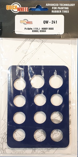 Unschwer durch den Namen zu erraten beschäftigt sich QuickWheel mit Rädern. Bei dem Artikel mit der Nr. QW-241 handelt es sich um eine Maskierschablone für den deutschen, „leichten“ Pz.Kpfw. I Ausf. F und II Ausf. J, zugeschnitten auf die Hobby Boss Bausätze 83803 und 83804. Auch wenn nicht angegeben, gehe ich davon aus, dass die Schablone auch für den Bausatz 83805 dürfte. Leider liegt mir keiner der Hobby Boss Bausätze vor, so dass ich es nicht endgültig bestätigen kann. Die Schablone besteht aus festem, dickem Material, in das die Lauf- und Leiträder perfekt passend hineingelegt werden können, um sie zu lackieren.