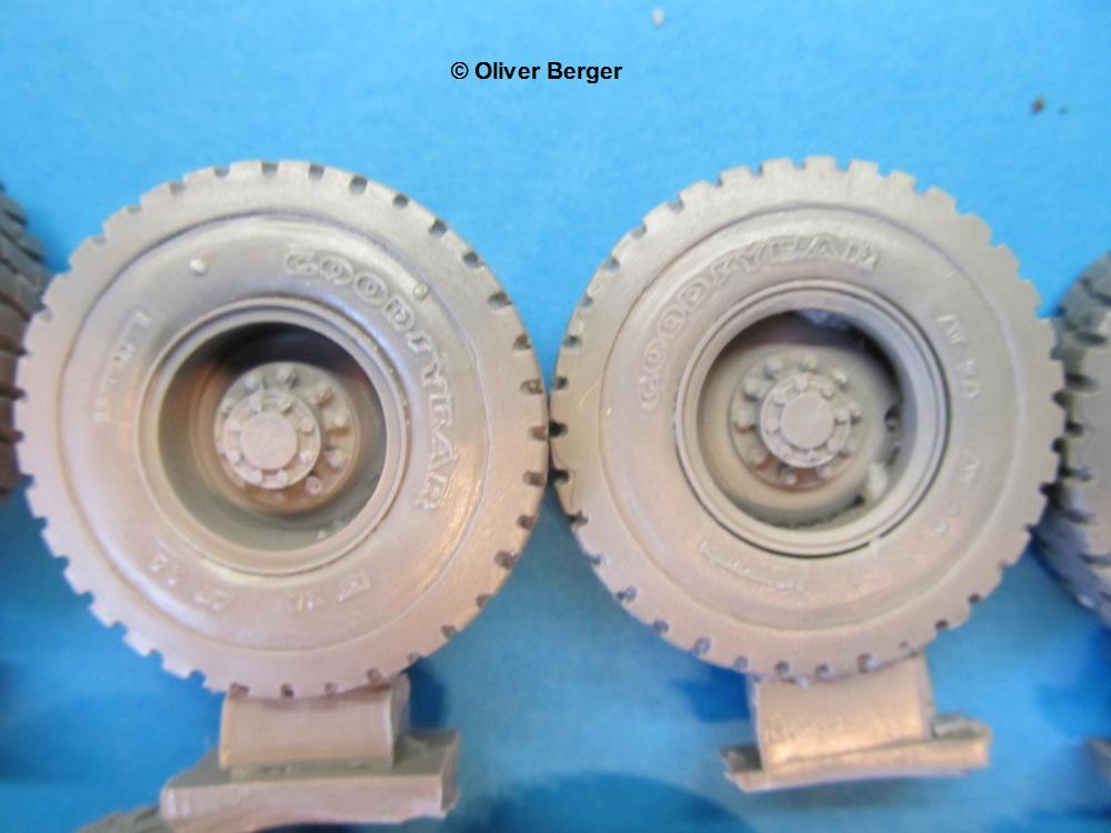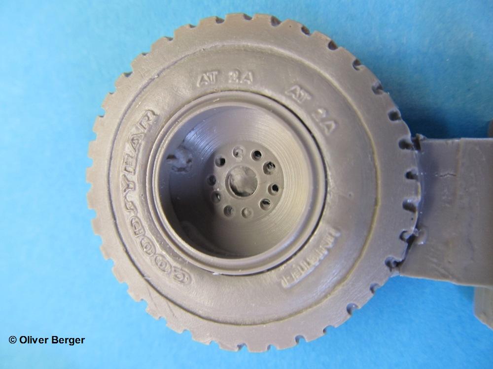Die Schachtel ist für die Menge etwas groß geraten, so dass man auf den ersten Blick denkt da wäre noch ne Überraschung drin. Es sind aber nur die Räder die gut in Styroporflocken verpackt sind. Die Reifen sind sauber gegossen und weisen ein sehr feines Profil auf, genau so wie der Herstelleraufdruck, in diesem Fall von Good Year. Der Grad der Belastung ist auch so dargestellt, dass es nicht aussieht als wäre das Fahrzeug heillos überladen. Leider muss man hier etwas mehr versäubern. Im Bereich des Anguss gibt es in den Gussformen wohl einen kleinen Versatz. Aber ist man aufmerksam fällt das nicht mehr auf