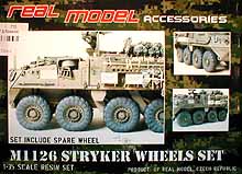 Nachdem nun der erste Stryker von AFV Club seit einiger Zeit im Handel erhältlich ist erscheint reichlich Zubehör für die Stryker Reihe. Von Real Model ist unter der Art. Nr. RMA35143 ein Set mit Resinrädern erhältlich. Die Packung enthält 8 Räder und sogar einem Reserverad aus hellgelbem Resin. Man sieht auf vielen Fotos reichlich "Gerödel" und auch Ersatzräder die von den Fahrzeugbesatzungen außen am Stryker verstaut wurden. Wer also sein Modell nach Übung oder Einsatz aussehen lassen möchte ist mit diesem Set sehr gut beraten.