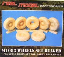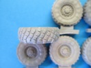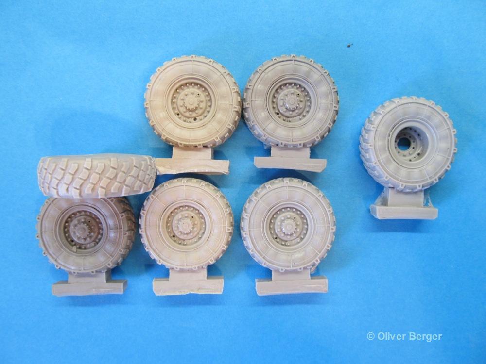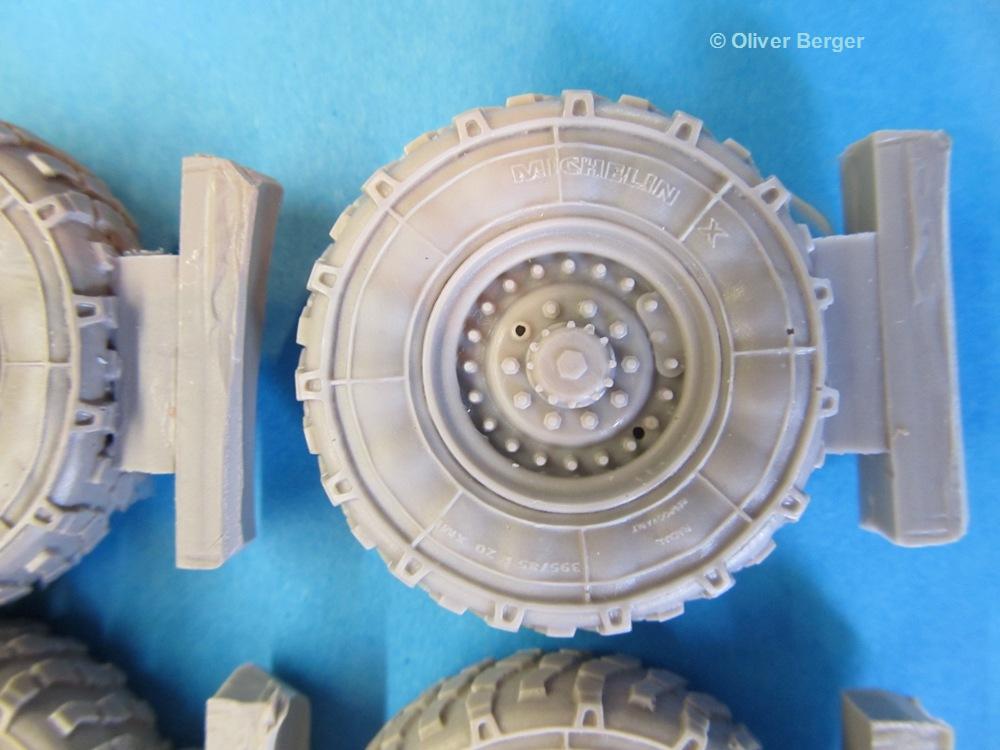 Von Real Model kommen mit der Nummer RMA35241 die Räder für den M1083 von Trumpeter angerollt. Ein schöner Satz, der durch die dargestellte Belastung den eh schon imposanten LKW richtig gut da stehen lassen dürfte. Die Räder sind sauber, ohne Blasen oder ähnlichen Fehlbildungen in grauem Resin gegossen. Die Aufdrucke auf den Flanken sind mir etwas schwach, aber das kann nach dem Bemalen auch wieder anders aussehen oder wirken. Das Profil ist super fein und die Gesamterscheinung ist schon so gestaltet, dass nicht jeder Reifen aussieht wie der andere. Fazit: Für gut 20,-€ nicht grade ein Schnäppchen, aber lohnenswert, wenn man die Belastung bei dem M1083 darstellen will.