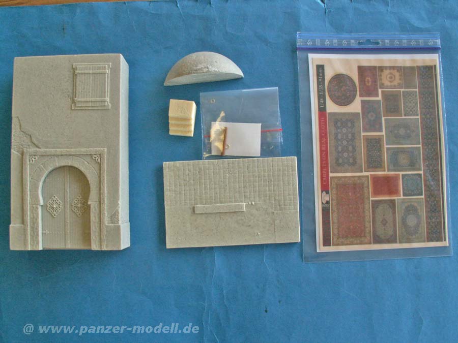 Im Set enthalten sind große, gut gegossene Resinteile für die Hausfront an sich, eine Viertelkugel für die Darstellung des Daches, ein Stück Treppe, eine Grundplatte, ein Stück Rundholz und ein Bogen der bekannten Teppiche auf filzigem Untergrund.