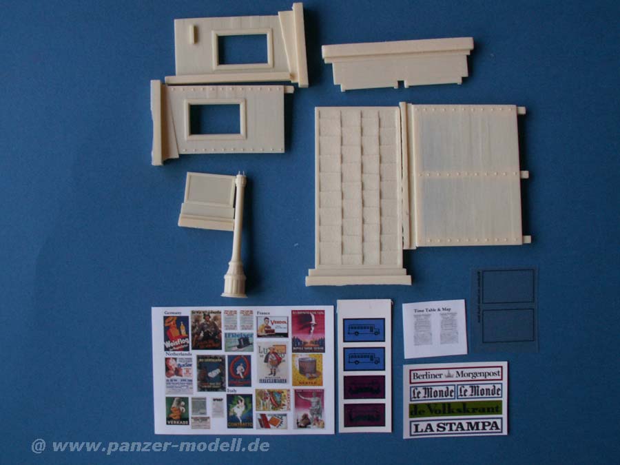 Im Set enthalten sind 7 sehr feine Resinteile, ein bedruckter Bogen mit zwei Fahrplänen, Emailleschilder mit Zeitungsreklame für Deutschland, Frankreich, Italien und Niederlande, Schildern mit Bus und Straßenbahnpiktogramm, sowie durchsichtieg Acetatfolie für die Fenster und ein recht großer Bogen mit Plakaten aus Deutschland, Frankreich, italien und Niederlande.