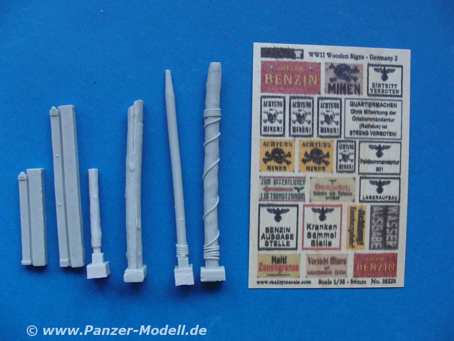 In diesem Set finden sich 6 Resinteile und ein dünner Bogen aus Echtholz mit aufgedruckten Schildern.