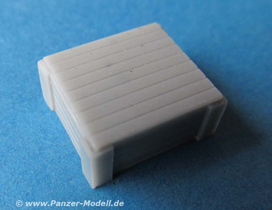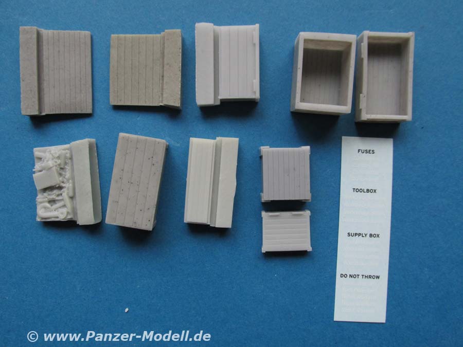 In diesem Set finden sich 10 Resinteile und ein Decalbogen zum Bau von sieben Kisten.