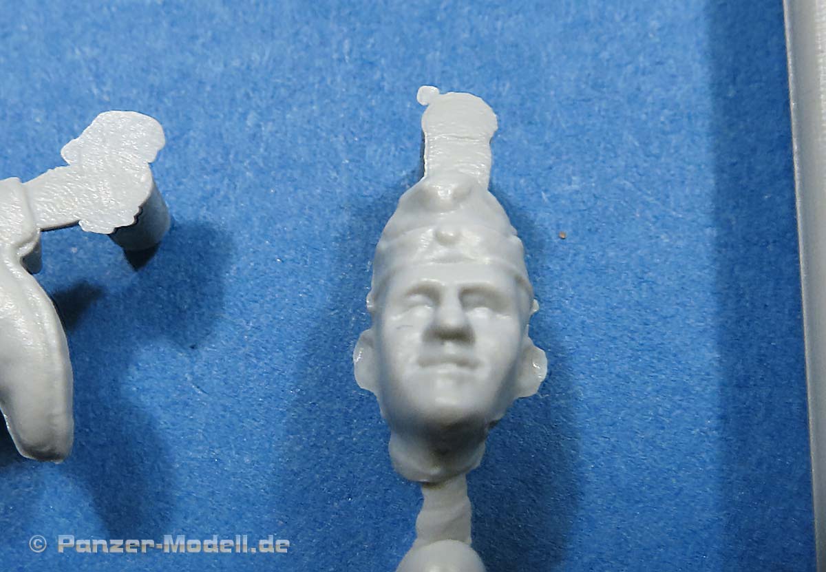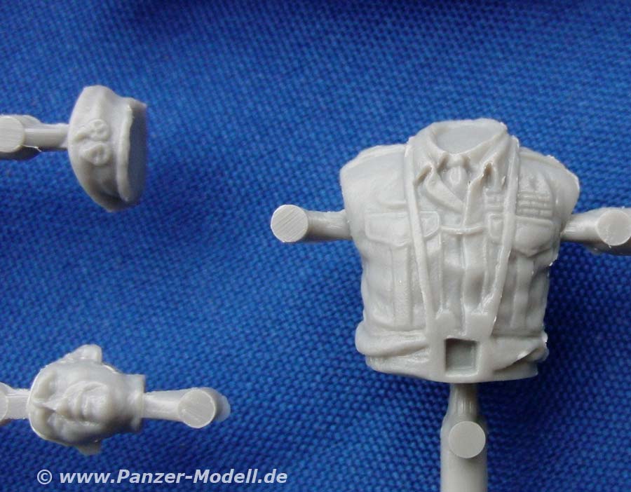 Die beiden Soldaten als Reiter setzen sich aus jeweils 6 Teilen zusammen und für jeden Soldaten liegen je zwei verschiedene Oberkörper bei. Die Details sind ganz ordentlich gemacht, wennauch ein wenig soft und Fischhäute an den Nähten. Zusätzlich liegt noch ein Bogen Decals bei für die Abzeichen der Figuren (Adler, Dienstgradabzeichen, Schulterklappen und Kragenspiegel)