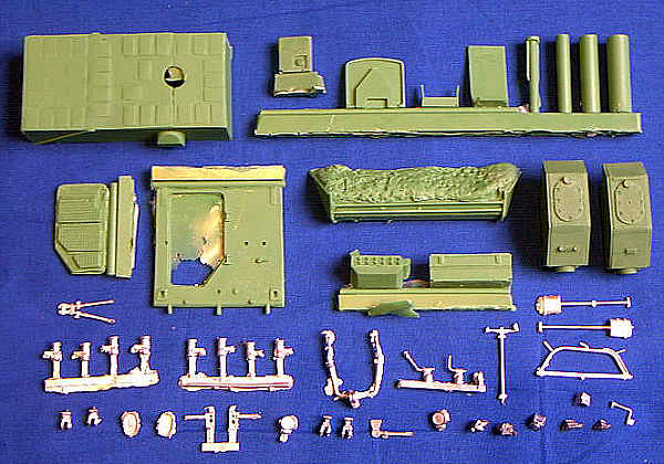 Enthalten sind u.a. ein neues Heck, das neue Stromerzeugeraggregat am Turmheck, neue Schmutzfänger, sowie diverse Staukisten. Auch die im Tamiya Bausatz fehlenden Stossdämpfer für die dritte Laufrolle von hinten liegen bei, womit ein störender fehler des Basisbausatzes entfernt wird.