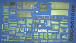 Insgesamt bekommt man 92 Teile plus 2 Ätzplatinen mit verschiedenen Sachen wie Staukorb, Abdeckbleche, desweitern liegt noch ein Rundprofil für die Achsen bei sowie 2 dünne sheet streifen, der Detailgrad ist gut so, da es an einen FUG nicht so viele hervorstechende Details gibt. Die Räder machen nen guten Eindruck obwohl noch kleine Luftblasen zusehen sind, was aber kein Problem darstellen dürfte. Allerdings ist hier das größte Manko zu finden, denn es sind nur linke Räder enthalten - d.h. die Laufrichtung des Profils ist für alle 5 Reifen die gleiche und das soll laut Hersteller auch so bleiben ... schade eigentlich!