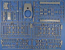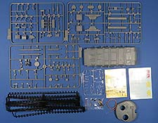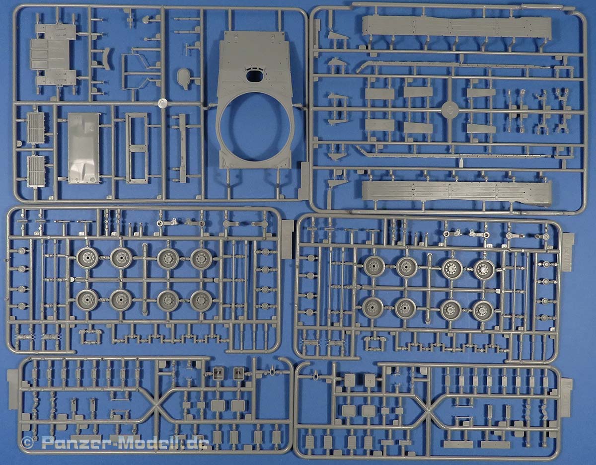 Werfen wir also einen genaueren Blick in den Bausatzkarton. Hier finden wir 17 graue, 5 schwarze Spritzlinge, 9 Gummispritzlinge, ein Klarsichtspritzling, die Unterwanne, das Turmoberteil, eine PE Platine, 15 gedrehte Metallteile, verdrilltes Kupferseil und ein Decalbogen.