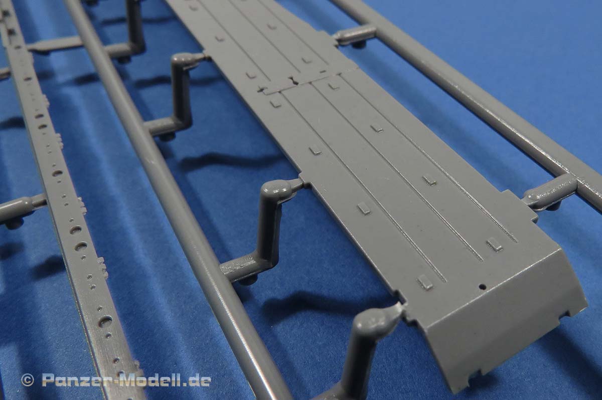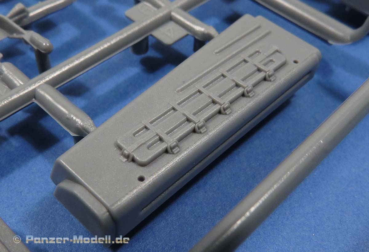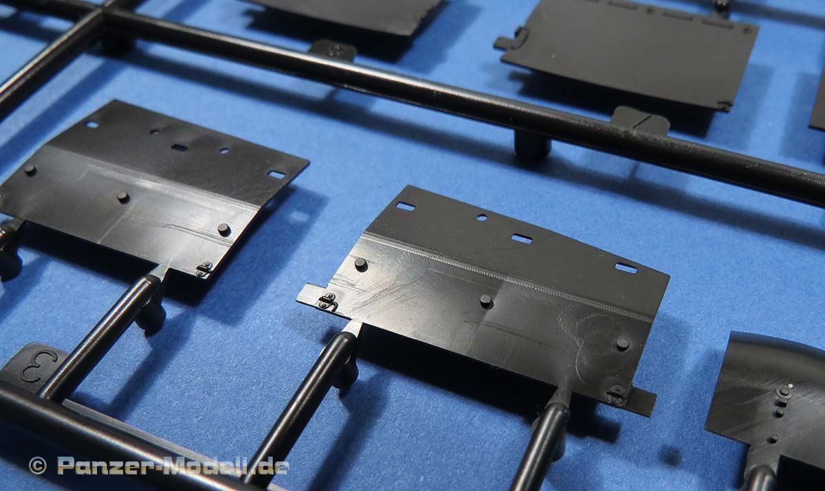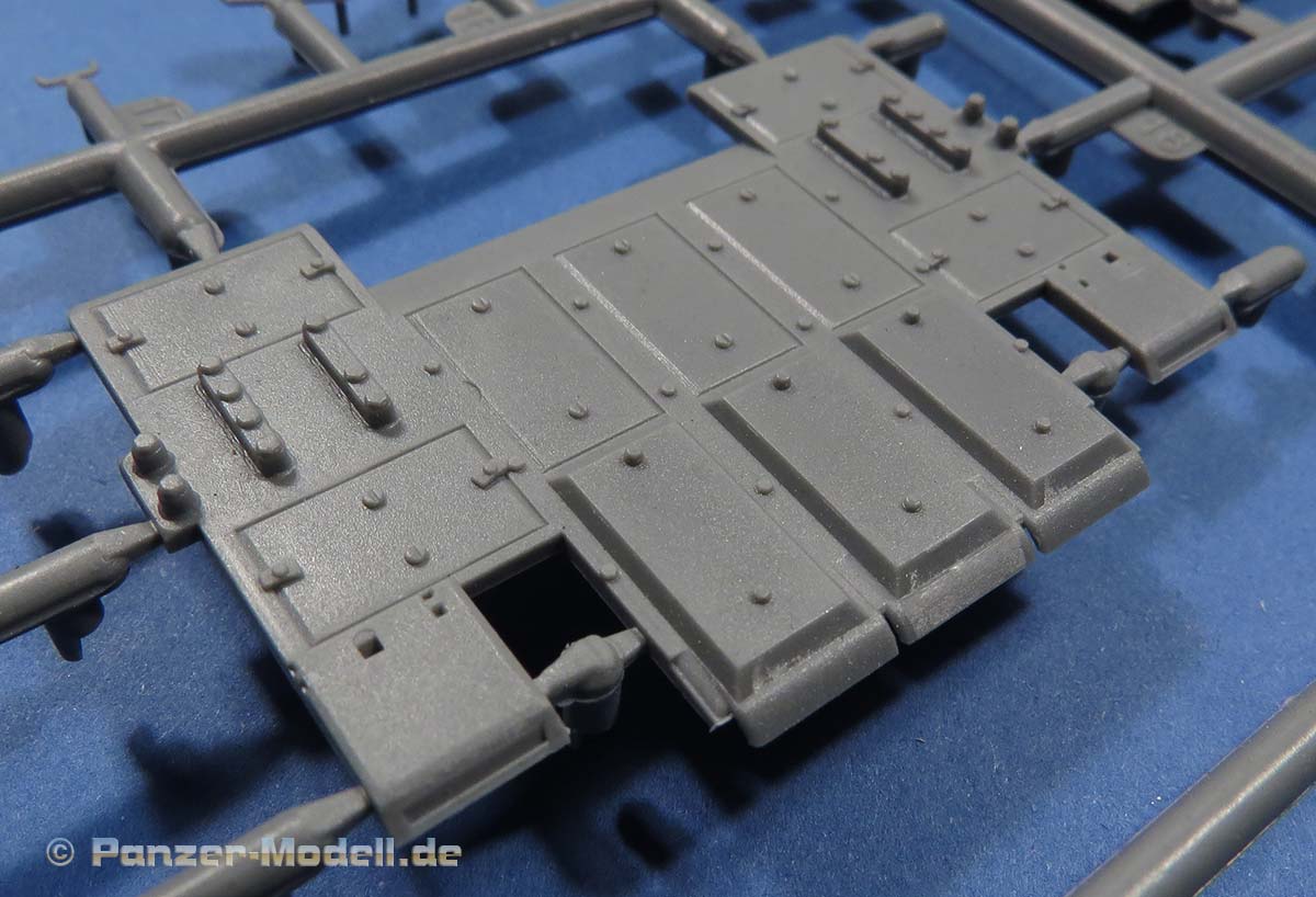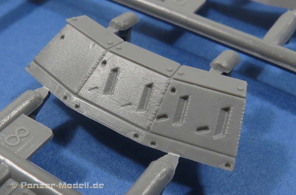 Die Kettenbleche liegen einzeln bei und haben schöne und scharfe Details, wie etwas die Versteifungsrippen. Auf diesen werden die Zusatzstaukisten angebracht, die ebenfalls sauber und fein gespritzt sind.