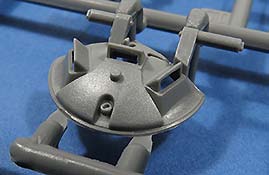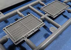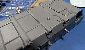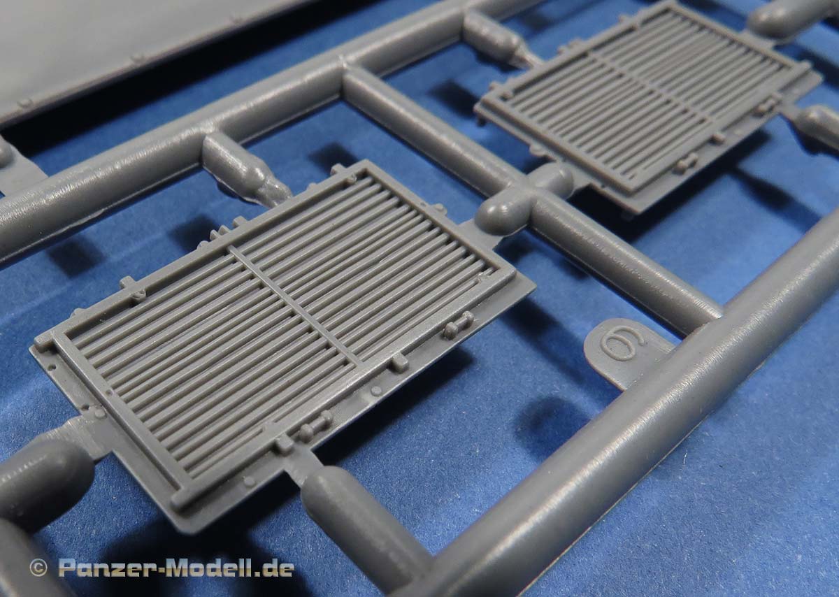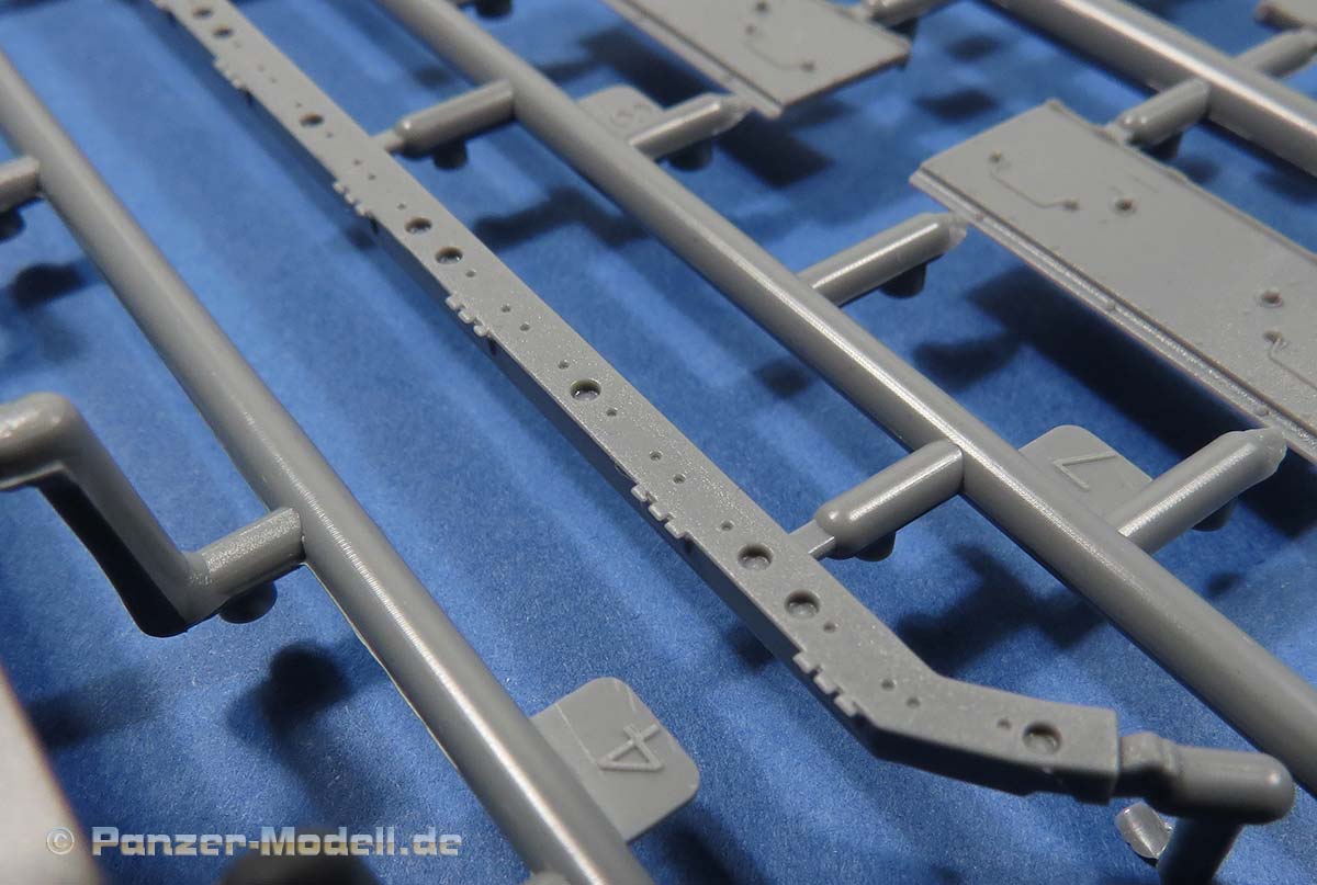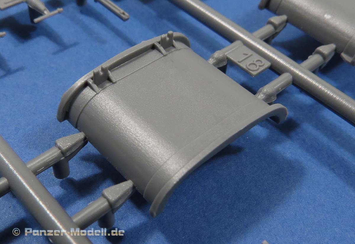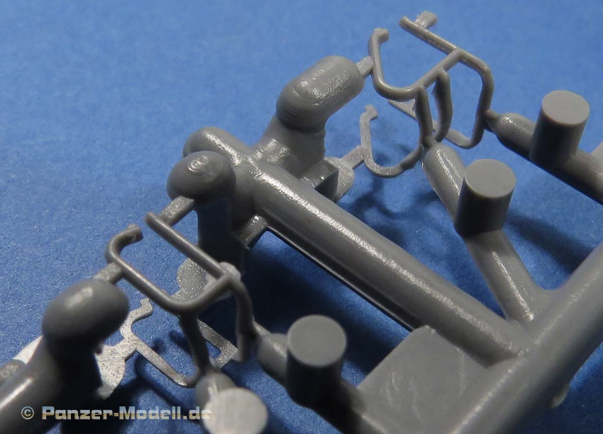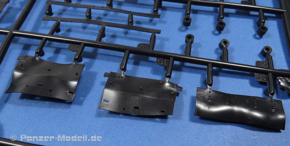 Die Kettenbleche liegen einzeln bei und haben schöne und scharfe Details, wie etwas die Versteifungsrippen. Auf diesen werden die Zusatzstaukisten angebracht, die ebenfalls sauber und fein gespritzt sind.
