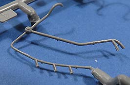 Schauen wir mal etwas genauer hin ... Die Unterwanne ist einteilig mit feinen Details bereits mit angegossen. Das Laufwerk setzt sich aus einzelnen Drehstäben zusammen, die beweglich mit den Schwingarmen eingesteckt werden - sogar die Anschlagdämpfer/Hydraulikteile sind beweglich mit ausgeführt - hier werden auch die ersten gedrehten Metallteile mit eingebaut.