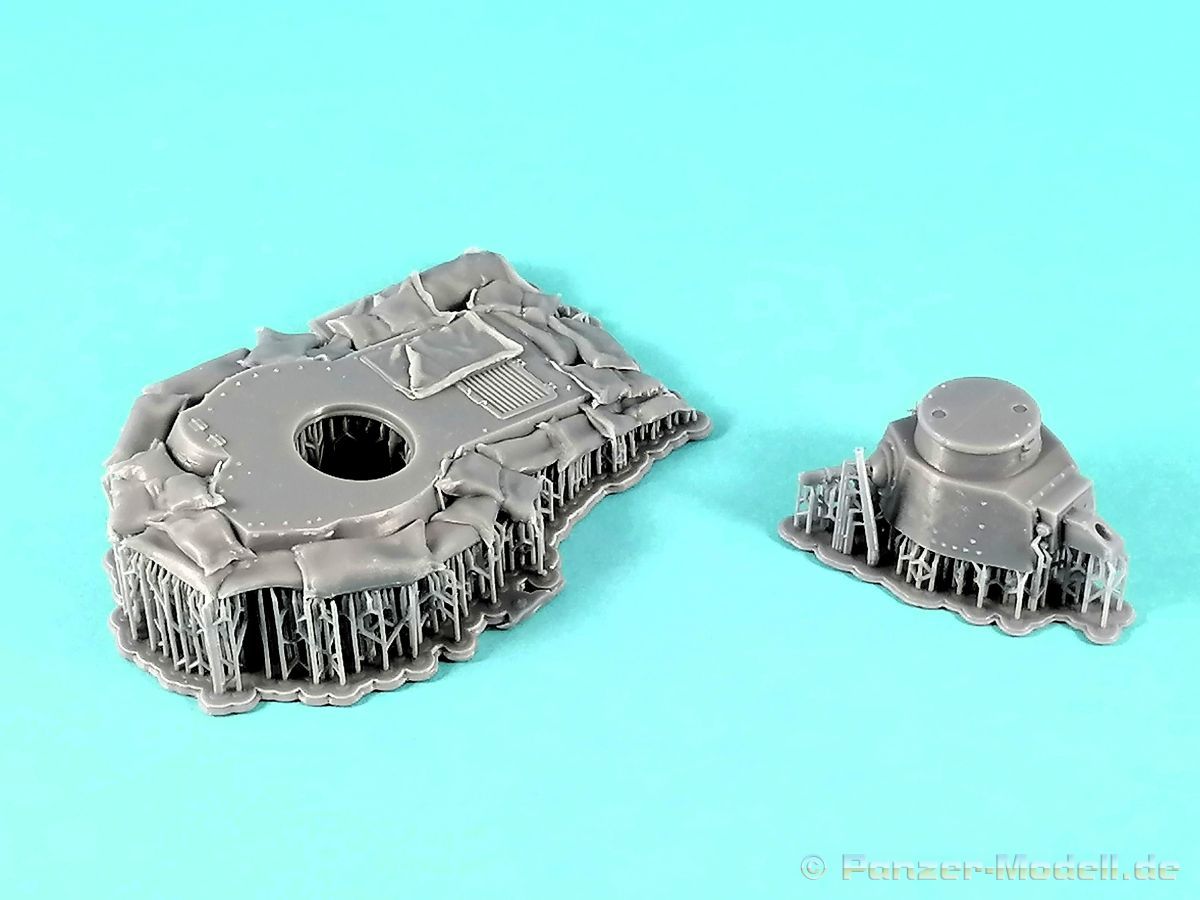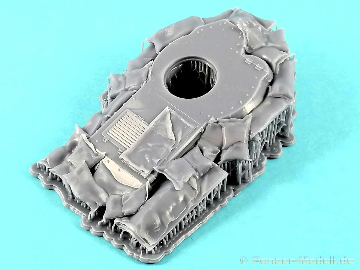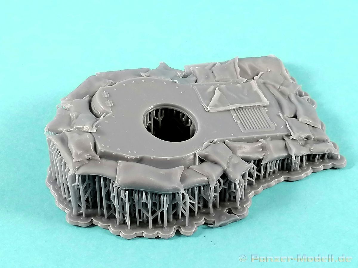 Diesmal geht es mit RT zu einer Strandbefestigung in den pazifischen Raum. Erneut ein Kit für Dioramenbauer… Die stabile Kartonbox offeriert uns eine Dioramenbasis aus Keramik und zwei Grundplatten mit gedruckten Teilen für einen eingegrabenen japanischen Panzer. Alles kommt wie gewohnt perfekt in Folie verpackt daher. Die Basis ist mit 18 x 26 cm ausreichend dimensioniert. In der linken Ecke ist bereits eine plane Fläche ersichtlich die für den Panzer vorgesehen ist. Vom Meer her gesehen finden wir vorne im linken Bereich eine Befestigung des Strandes mit Baumstämmen, der Struktur nach könnten es Palmen sein. (Dahinter die erwähnte Fläche für den Panzer.) Dieser läuft im rechten Bereich aus. Daran schließt sich ein Wall aus Sandsäcken an der nach hinten hin ausläuft. Alles sehr schön dargestellt und eine gute Grundlage zur weiteren Verfeinerung des Geländes. Für den Panzer liegen zwei Grundplatten mit den gedruckten Teilen des Panzers bei. Die Größere trägt die Oberwanne die mit feinen Details punkten kann. Sandsäcke und Planen verwischen die scharfen Konturen des Panzers. Der Turm und das Rohr befinden sich auf der kleineren Druckplatte. Auch dieses Bauteil kann vollkommen überzeugen. Der Druck ist ebenfalls fehlerfrei und erneut gibt es feinste Details. Hinweis: Die auf dem Kartonbild abgebildeten Bäume sind nicht Bestandteil des Kits. Hier gibt das rechte, kleinere Bild den Inhalt des Kartons wieder… Ein toller Kit für Dioramenbauer!