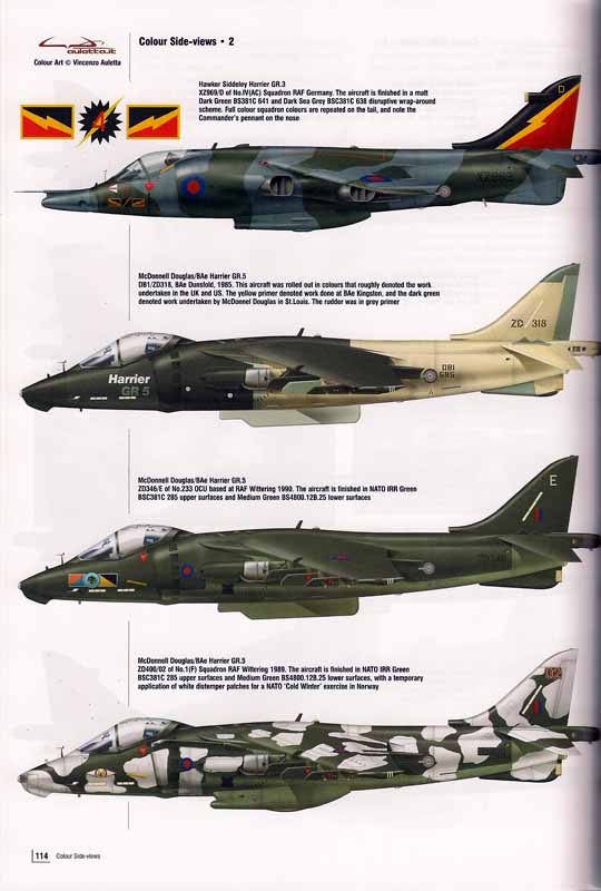Seiten mit Farbansichten von verschiedenen Ausführungen des Harrier sowie eine