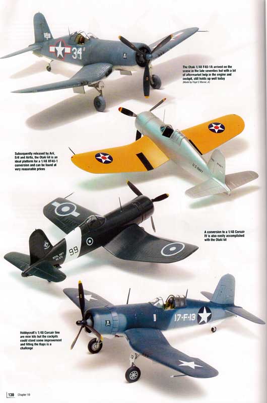 Das Kapitel 10 trägt das Thema Modellbau. Hier werden die Corsair von Tamiya, Academy, Hasegawa und vielen weiteren Herstellern in den Maßstäben 1:72, 1:48 und 1:32 im Modell vorgestellt. Anschließend wird das Gesamtprogramm an Corsair Bausätzen der verschiedensten Hersteller in allen verfügbaren Maßstäben sowie eine Übersicht der verschiedenen, im Handel erhältlichen, Zurüstsätze und die dazu passenden Decalsätze.