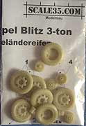 Für den 1/35er Sektor hat sich Scale35.com zunächst etwas sehr schöne svorrgenommen, nämlich einen 8-Loch Geländereifensatz für Opel Blitz unter der Nummer 35-1001.