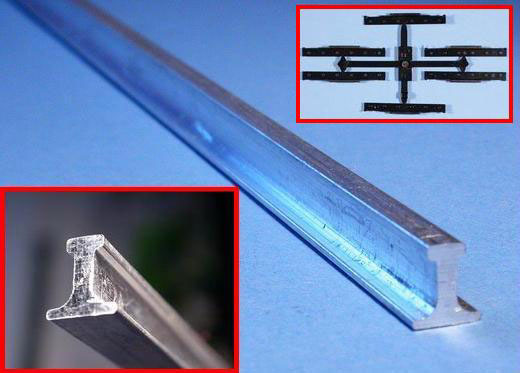 Vier Doppelgleis Segmente zu je 50cm x 29cm ergeben mit den beiden Endstücken die beeindruckende Grundlage von über 2m Länge, um die DORA zu parken. Da sollte man vor Baubeginn schon genau wissen, wo das Modell einmal stehen wird. Mit den optisch ansprechenden Aluminium-Profilen und den Schienenverbindern wird der Unterbau (Schotterbett mit Schwellen) komplettiert.