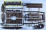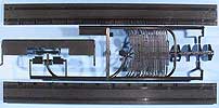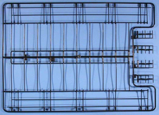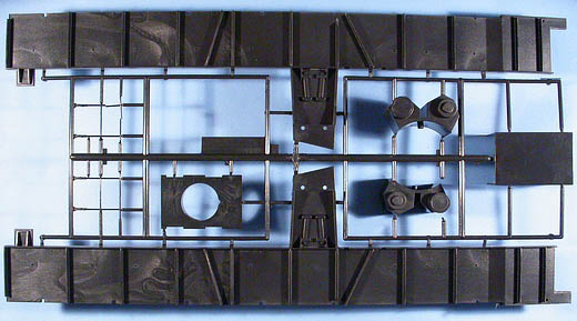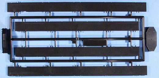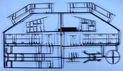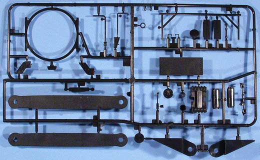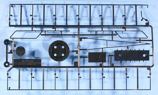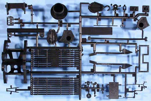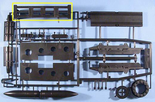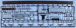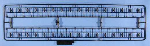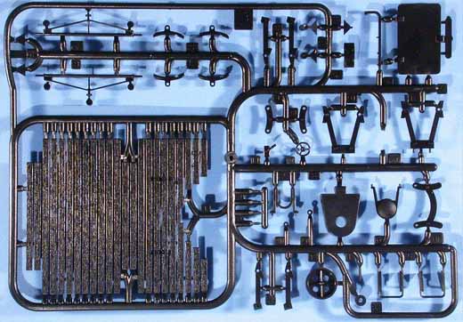 Im Karton finden sich 96 Spritzlinge aus schwarzem Kunststoff sowie 147 separate Teile für z.B.:16 Teile für die Fahrwerkrahmen, 6 Teile für das Gleisbett, 16 Profil-Teile aus Aluminium für die Schienen, 6 Teile für das Geschützrohr, 80 Laufräder, 1 Faltkarte mit 10 PE-Teilen, 3 Spiralfedern, 2 Stück Hutgummi und ... Schrauben