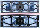 Das Fahrgestell besteht aus 4 einzelnen Laufwerken, die sich aus jeweils diversen Einzelteilen sowie je 2 Ober- und Seitenteilen ergänzt von 10 Radpaaren zusammensetzen. Hier wird dann auch nicht geklebt sondern mit jeweils 12 Metallschrauben das Ganze verbunden. Mit dem Aufbau von Teil E1 und der PE-Teile V1 wird dann jedes Laufwerk zum echten Drehgestell. Puffer, Kupplung, Handläufe und Feststellbremse sind nur einige der Dinge, die das Fahrgestell der DORA komplettieren.