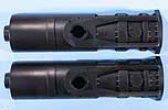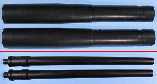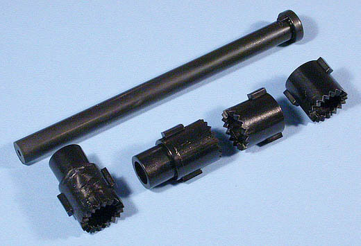 Gleichfalls aus 2 Hälften bestehen das Rohr-Mittelstück(Mantelrohr) und das Rohrvorderteil(Seelenrohr). In Letzteres wird nach dem Zusammenbau ein ca. 4cm langes Profilstück, das mit Feldern und Zügen versehen ist, eingesetzt. Ein wie mir scheint nicht besonders gelungener Versuch, die Original-Optik im Modell umzusetzen, denn Erstens hat man bei diesem Kaliber einen tiefen Einblick ins Innere des Geschützrohres (auf jeden Fall mehr als 4cm) und Zweitens fällt für meinen Geschmack die Gravur der Züge und Felder im Vergleich mit der Wandstärke zu heftig aus. Hier ist sicherlich Bedarf für den nachträglichen Ersatz der Originalteile vorhanden.