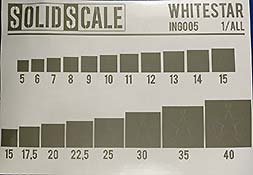 Insgesamt sind auf dem Bogen 19 einzelne Schablonen enthalten, die von 5 bis 15mm Größe schön aufgereiht in 1mm Schritten für die reinen Sterne und von 15 bis 40mm für die Sterne mit Kreis in größeren Schritten und jeweils mit den entsprechenden Zahlen deutlich in der Größe erkennbar sind.