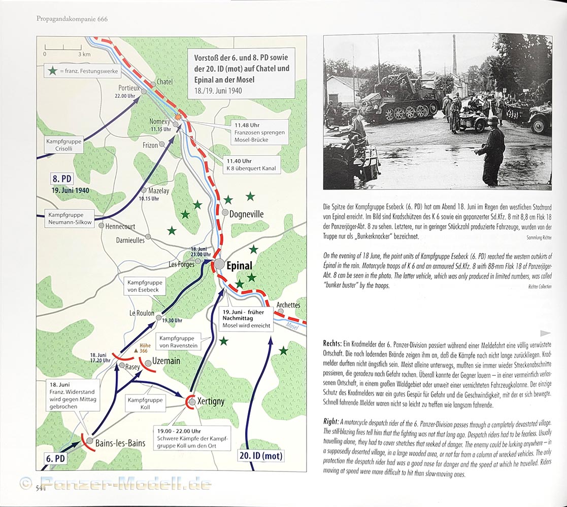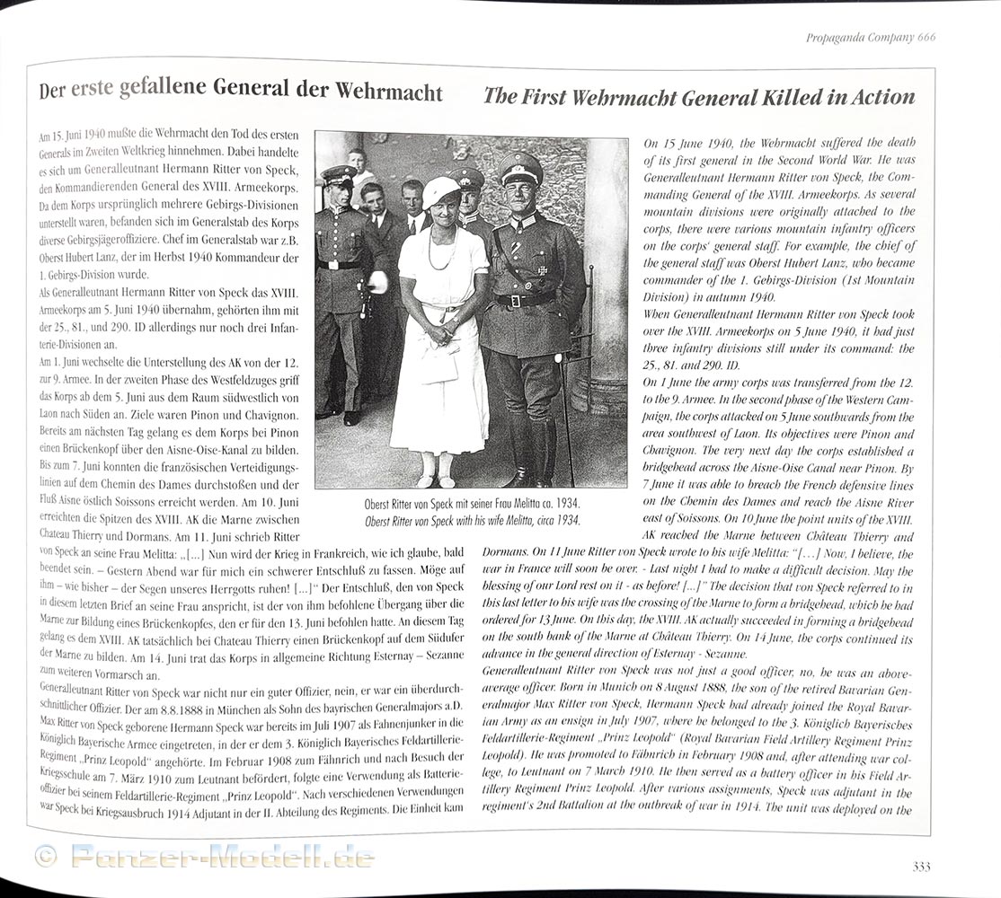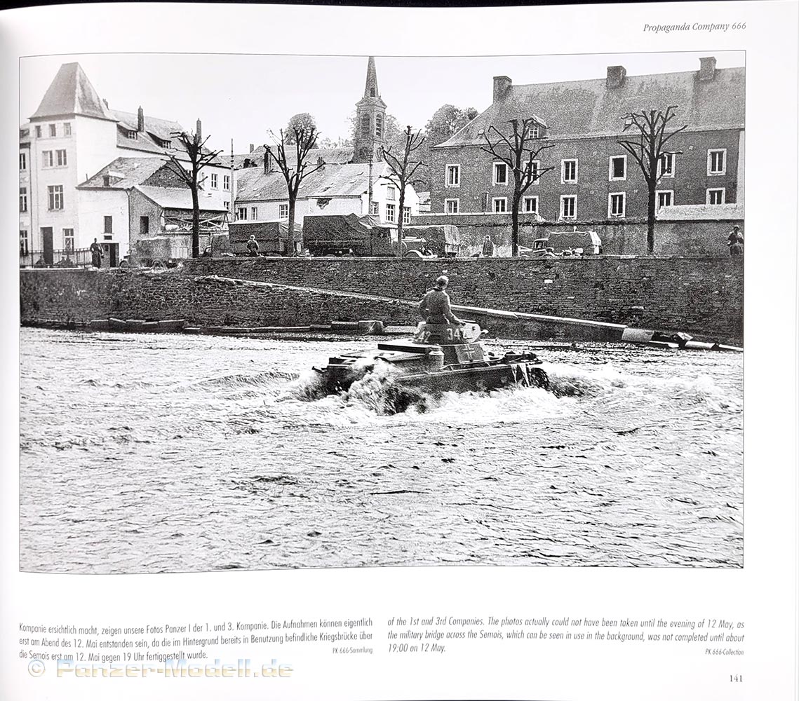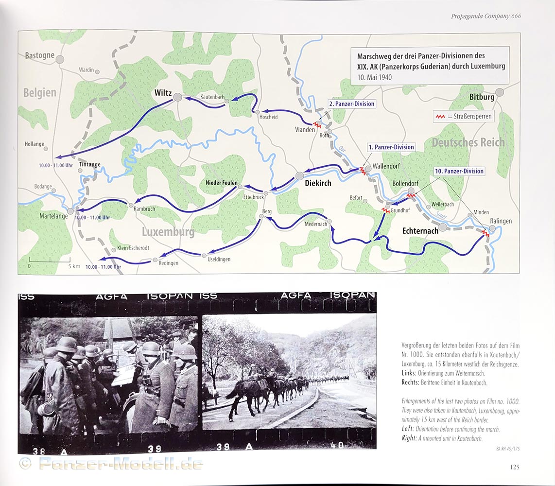 Die Fotografien sind auf hochwertigemP apier abgebildet, was nicht nur die Bildqualität betont, sondern auch die visuelle Wirkung verstärkt. Zusätzlich zum Bildmaterial enthält das Buch etwa 38 farbige Karten, die die geographischen Gegebenheiten und die Bewegungen der Truppen während des Westfeldzugs dokumentieren. Diese Karten sind eine wertvolle Hilfe, um die verschiedenen Einsätze und die geografischen Herausforderungen besser nachzuvollziehen. Das Buch gliedert sich in zwei Hauptteile, die zusammen einen umfassenden Blick auf die Geschichte der Propaganda-Kompanie 666 und ihren Einsatz im Westfeldzug bieten. Der erste Hauptteil des Buches beschäftigt sich mit der Entstehung und Struktur der Propaganda-Kompanie 666. Es wird detailliert erklärt, wie diese Kompanie innerhalb des nationalsozialistischen Regimes ins Leben gerufen wurde und welche Aufgaben sie übernahm. Die Propaganda-Kompanie 666 war eng mit dem Ministerium für Volksaufklärung und Propaganda unter Joseph Goebbels verbunden. Sie begleitete die Wehrmachtseinheiten an die Front und sollte die Kriegsberichterstattung nach den Vorgaben der nationalsozialistischen Ideologie gestalten. Der Autor geht auf die organisatorischen Aspekte ein, beleuchtet die Rolle der Kriegsberichter und beschreibt die politische Dimension dieser Einheit. Ein besonders interessantes Detail des Buches ist, wie sich die Zusammenarbeit zwischen dem Oberkommando der Wehrmacht und dem Propagandaministerium gestaltete und wie die Kriegsberichter gezielt eingesetzt wurden, um die öffentliche Meinung zu beeinflussen. Der zweite Teil des Buches nimmt etwa 80% des gesamten Umfangs ein und behandelt die Einsätze der Propaganda-Kompanie 666 im Westfeldzug 1940 vom 10.Mai bis 21.Juni 1940. Hier wird die Rolle der Kriegsberichter während des Vorstoßes durch die Ardennen, der Kämpfe um Sedan und den Maas-Übergang bis hin zu den Schlachten um Boulogne und Calais detailliert beschrieben. Die Berichterstatter der Kompanie begleiteten Infanterie-Divisionen des III. Armeekorps und des Panzerkorps von Guderian und dokumentierten aus nächster Nähe die militärischen Ereignisse. Der Leser wird durch die verschiedenen Schlachten und militärischen Operationen geführt, wobei die persönliche Perspektive der Kriegsberichter, die oft direkt an den Frontlinien arbeiteten, eine besondere Bedeutung hat. Es wird nicht nur die militärische Strategie behandelt, sondern auch der Alltag der Soldaten und die Auswirkungen der Propaganda auf die Moral und das Bild des Krieges in der Heimat. Ein weiteres spannendes Kapitel befasst sich mit den originalen Dokumenten und Berichten der Kriegsberichter, die aus erster Hand berichten und die Perspektive dieser Propagandaeinheit widerspiegeln. Diese Berichte geben dem Leser einen direkten Einblick in die Denkweise und die Arbeitsweise der Kriegsberichter, die oft inmitten des Geschehens agierten. „PK 666 – Die Propaganda-Kompanie 666“ ist das erste umfassende Werk, das sich intensiv mit dieser speziellen Einheit befasst. Axel Urbanke hat umfangreiche Recherchen betrieben und aus verschiedenen Quellen, darunter private Sammlungen und unpublizierte Berichte, das Bild einer Kompanie gezeichnet, die in der Geschichte des Zweiten Weltkriegs bislang wenig Beachtung fand. Das Buch stellt eine wertvolle Ergänzung zu bestehenden Arbeiten über den Westfeldzug und die Rolle der Propaganda im Krieg dar. Das Buch ist wie gewohnt komplett zweisprachig deutsch und englisch und damit international verständlich Insgesamt ein gut recherchiertes Buch, das sowohl für Militärhistoriker als auch Modellbauer von großem Interesse ist. Die Kombination aus umfassender Bilddokumentation, detaillierten Berichten und fundierter Recherche macht es zu einem wertvollen Nachschlagewerk für alle, die sich mit der Propagandaeinheit der Wehrmacht und ihrer Rolle im Westfeldzug beschäftigen möchten. Das beeindruckende Format und die hohe Qualität des Drucks machen das Buch zu einem wahren Sammlerstück. Wer sich für die Verbindung von Militärgeschichte und Propaganda interessiert, wird in diesem Werk auf eine Vielzahl von neuen und aufschlussreichen Informationen stoßen. "PK 666 - Die Propaganda-Kompanie 666 - Einblicke in die Geschichte einer Propaganda-Einheit Band I - Aufstellung und Westfeldzug 1940