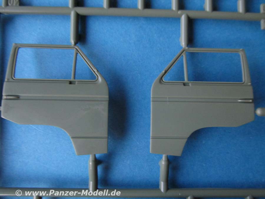 Natürlich liegen auch sämtliche Scheiben als passend gespritzte durchsichtige Plastikteile bei, wie auch entsprechende Klarsichtteile für die Heckleuchten. Der Innenraum der Doka ist recht komplett mit den Sitzen, Armaturenbrett, Lenkrad, Pedale, usw.