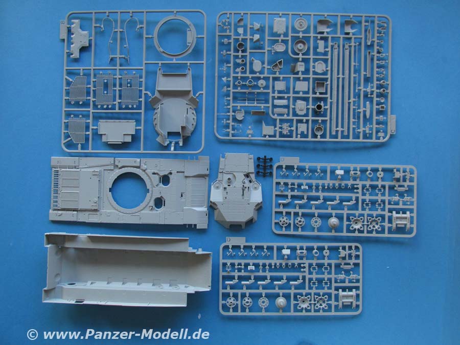 Im Karton finden wir insgesamt 11 graue Spritzlinge, ein klaren Spritzling, die Unterwanne, die Oberwanne, das Turmoberteile, die beiden Schürzenteile, Polycaps, eine Platine PE Teile und ein Decalbogen.
