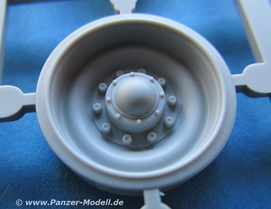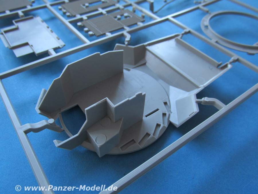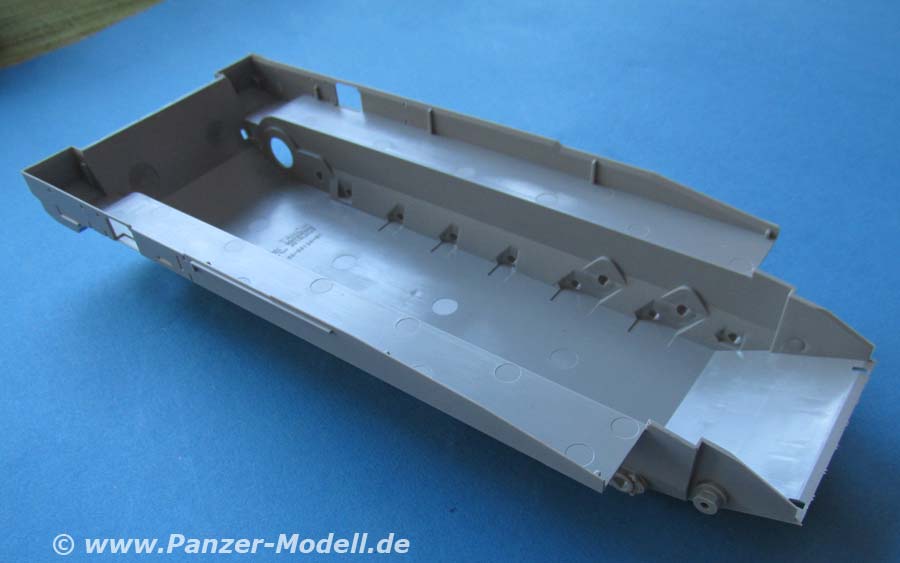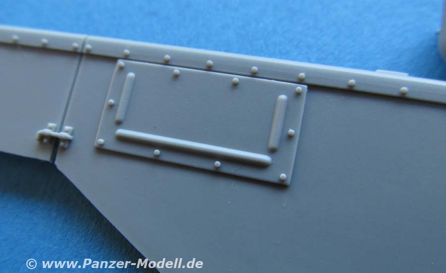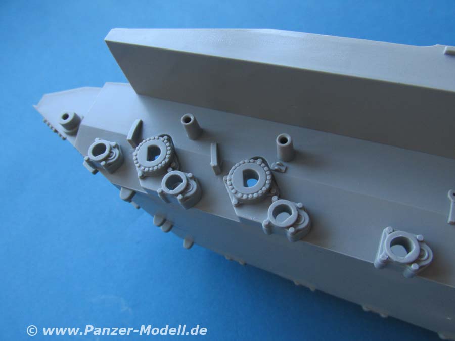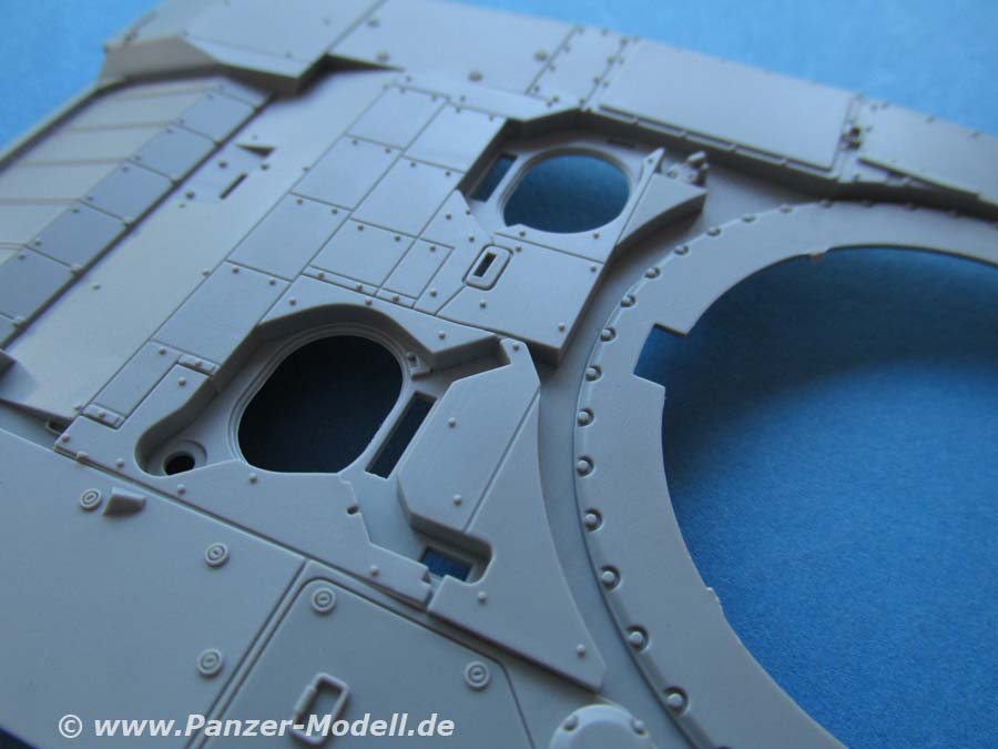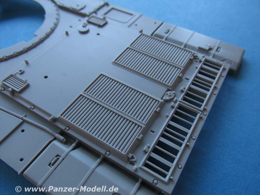 Auch die Oberwanne ist einteilig und mit wirklich schönen Details wie Schraubenköpfen, Zusatzpanzerblöcle, Lüfterlamellen, etc. versehen. Die beiden Luken in der Fahrzeugfront sind offen und können daher auch mit offenem Deckel gebaut werden.